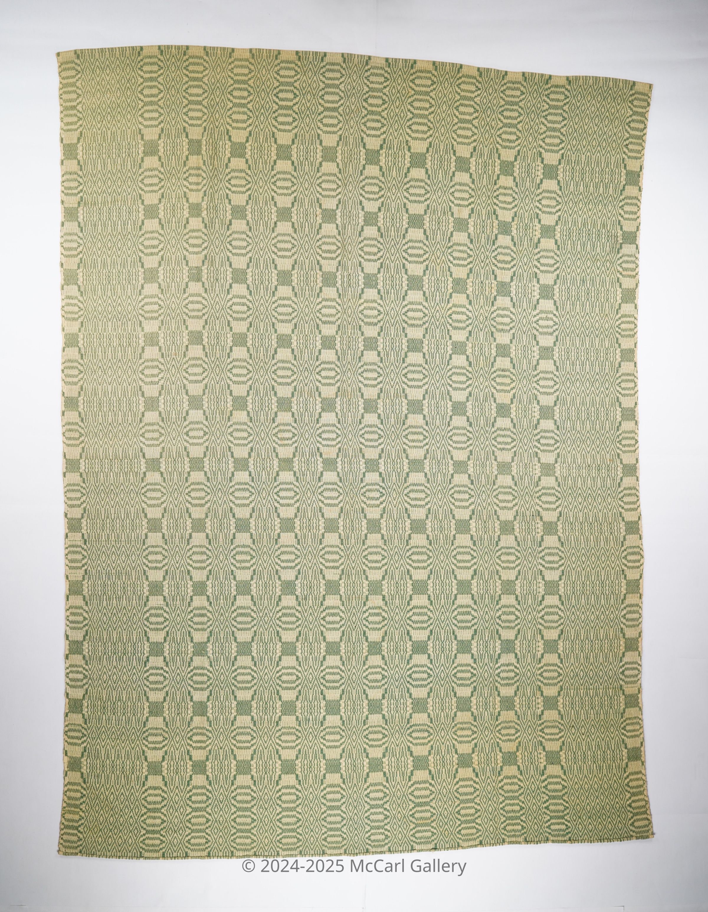 Geometric overshot coverlet with borders on four sides; no fringe. Woven full-width; seamless. Green wool with undyed cotton. Abstract centerfield and border patterns. Unknown weaver.Collection