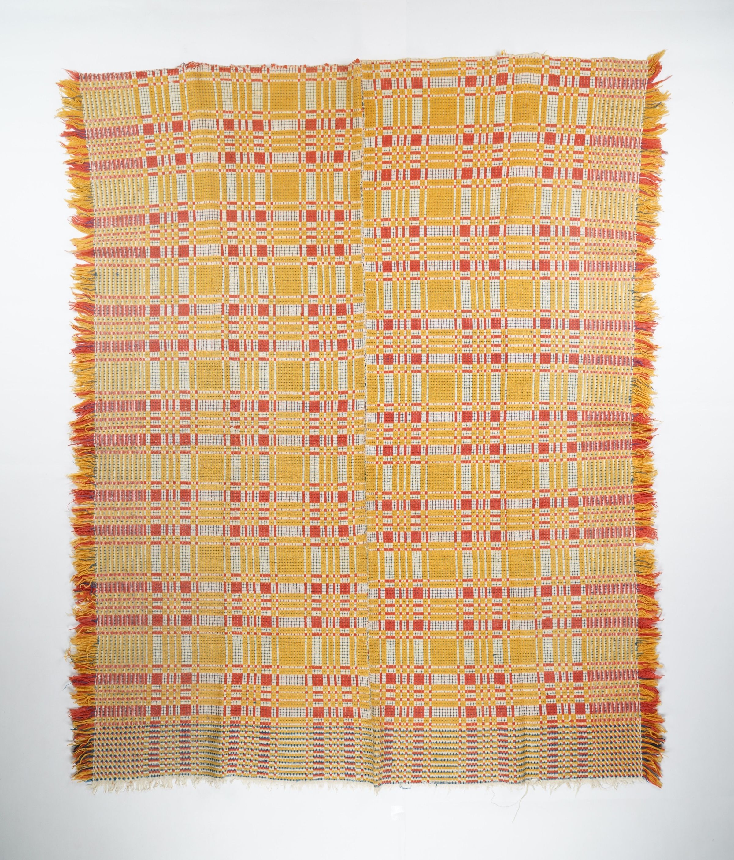 Geometric overshot coverlet with borders on 3 sides and self-fringe on [# sides or bottom]. Two panels joined by a center seam./Woven full-width; seamless. Gold and red wool with undyed cotton. Abstract centerfield pattern and borders on sides and bottom. Unknown weaver.Context