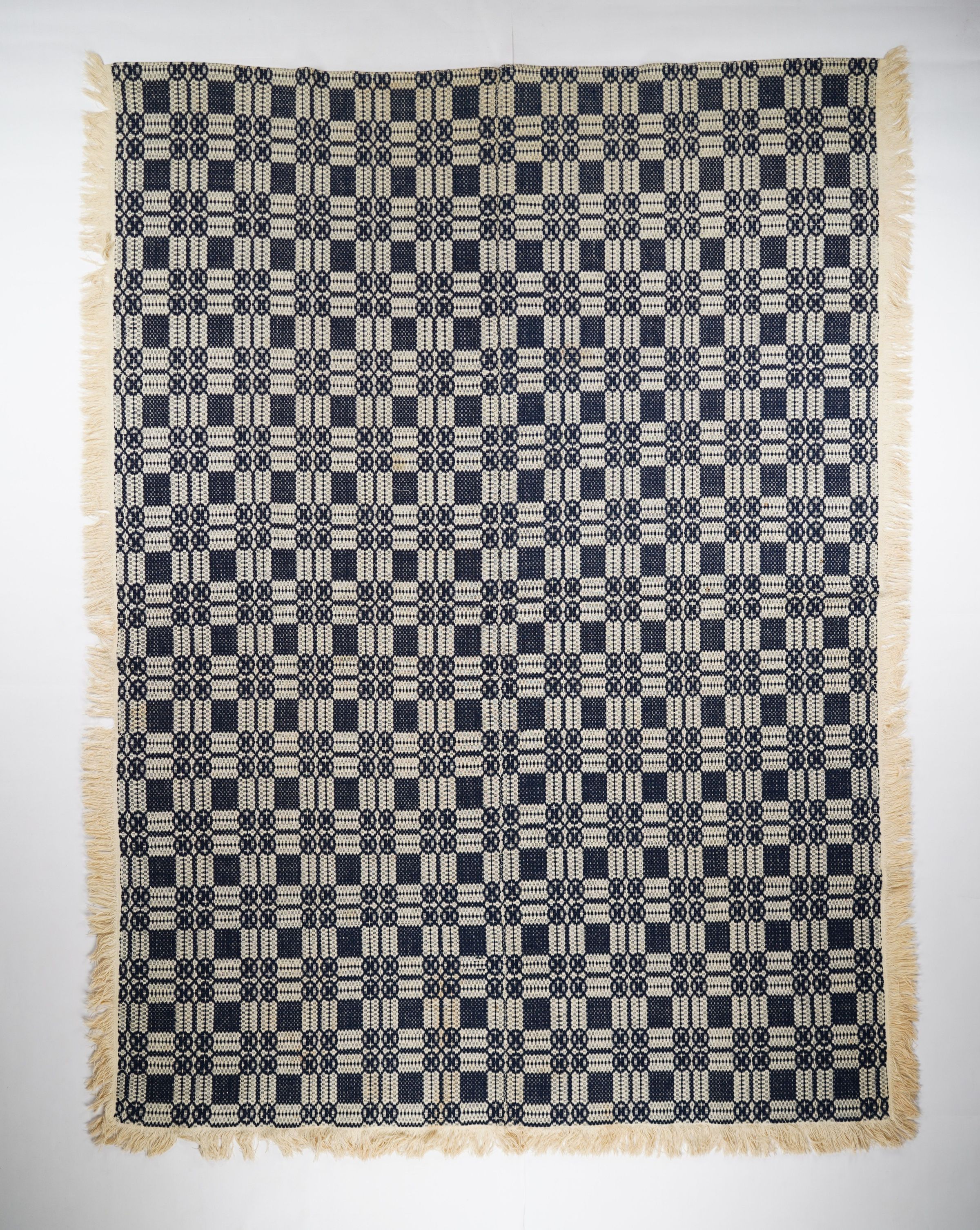 Geometric overshot coverlet with applied fringe on both sides and bottom. Two panels joined by a center seam. Navy wool with undyed cotton. Square and little circles centerfield pattern. Unknown weaver.Context