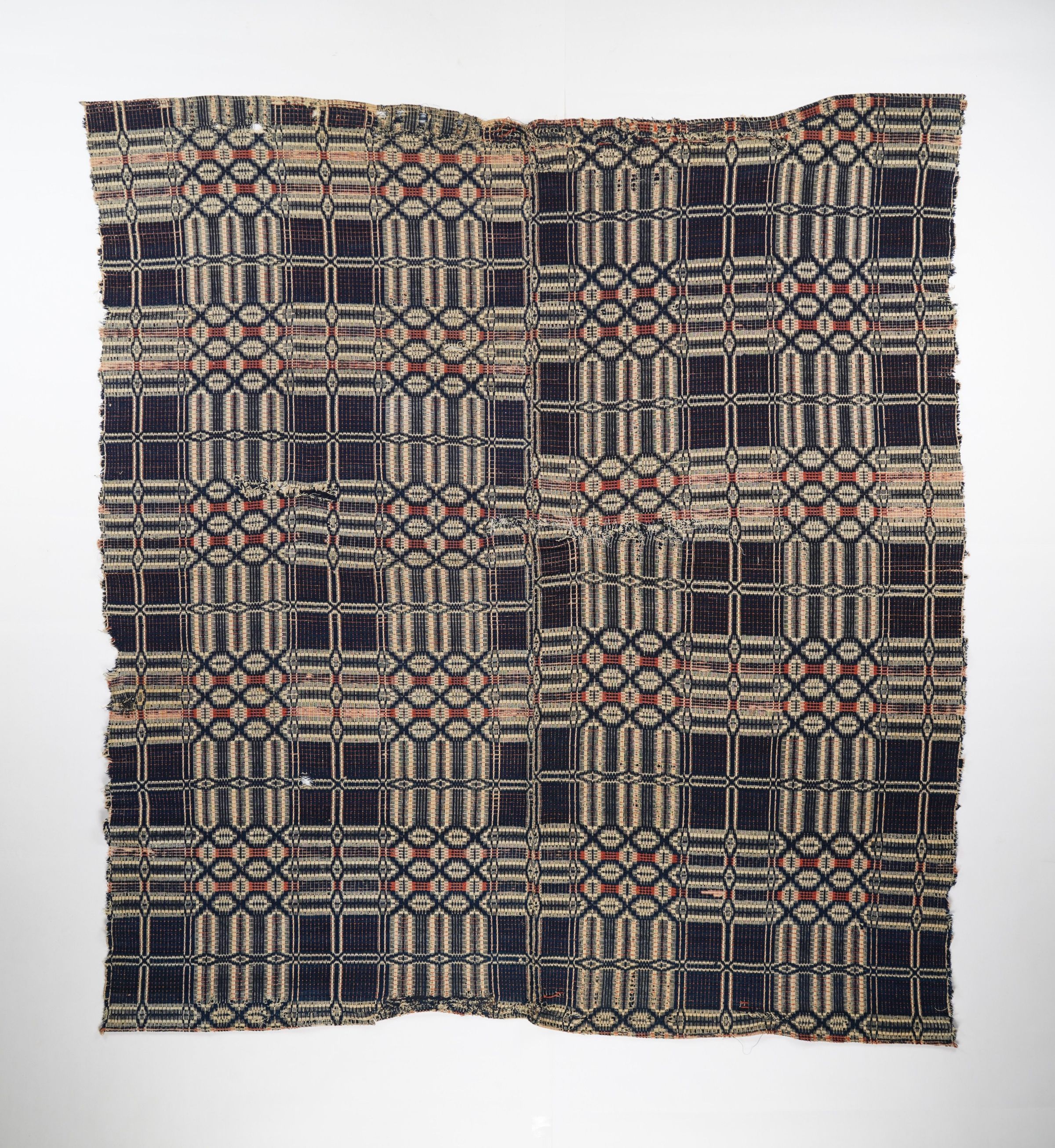 Geometric overshot coverlet with no fringe. Two panels joined by a center seam. Navy and red wool with undyed cotton. Abstract centerfield pattern. Unknown weaver.Context