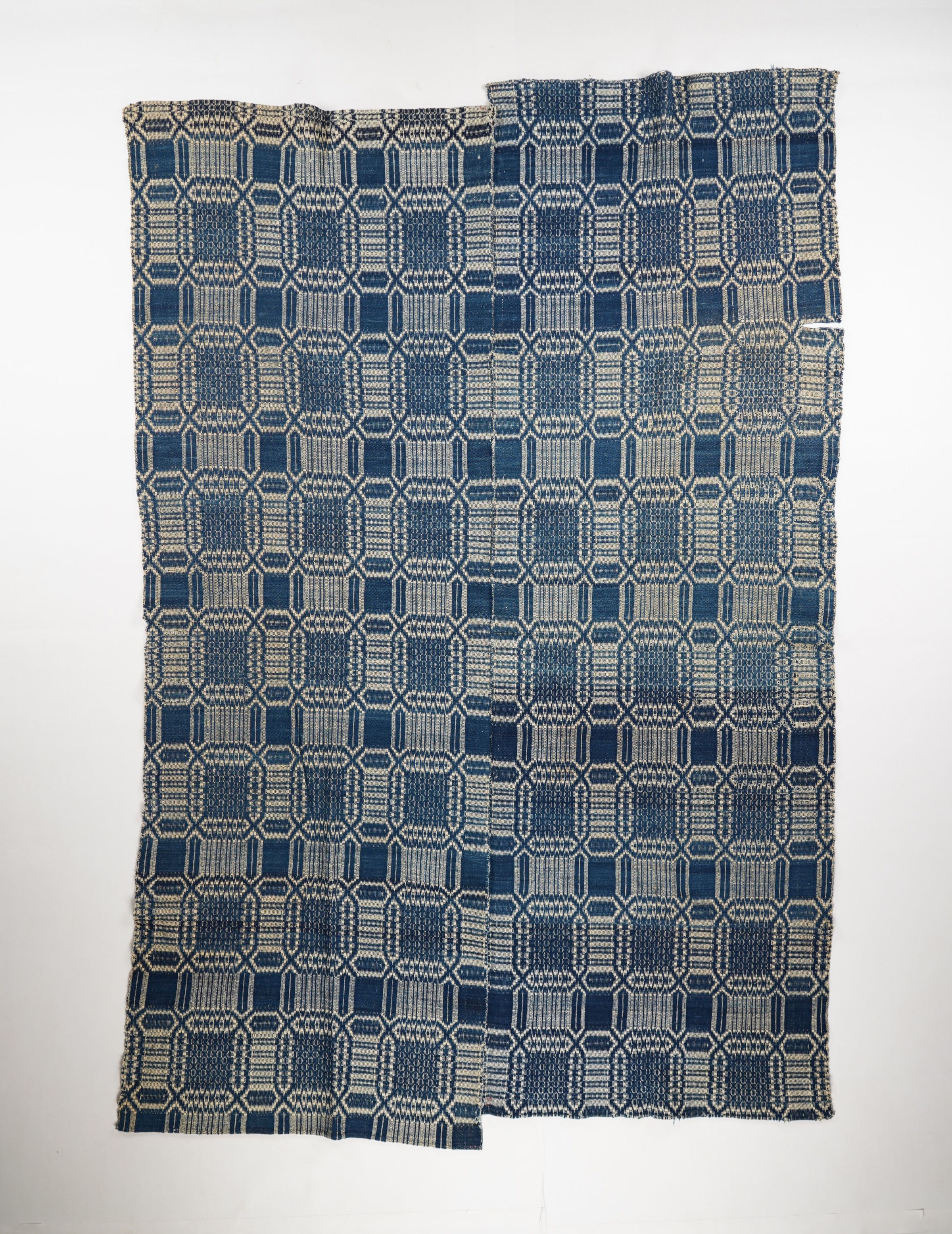 Geometric overshot coverlet with no borders or fringe. Two panels joined by a center seam. Navy wool with undyed cotton. Star and table geometric pattern. Unknown weaver.Context