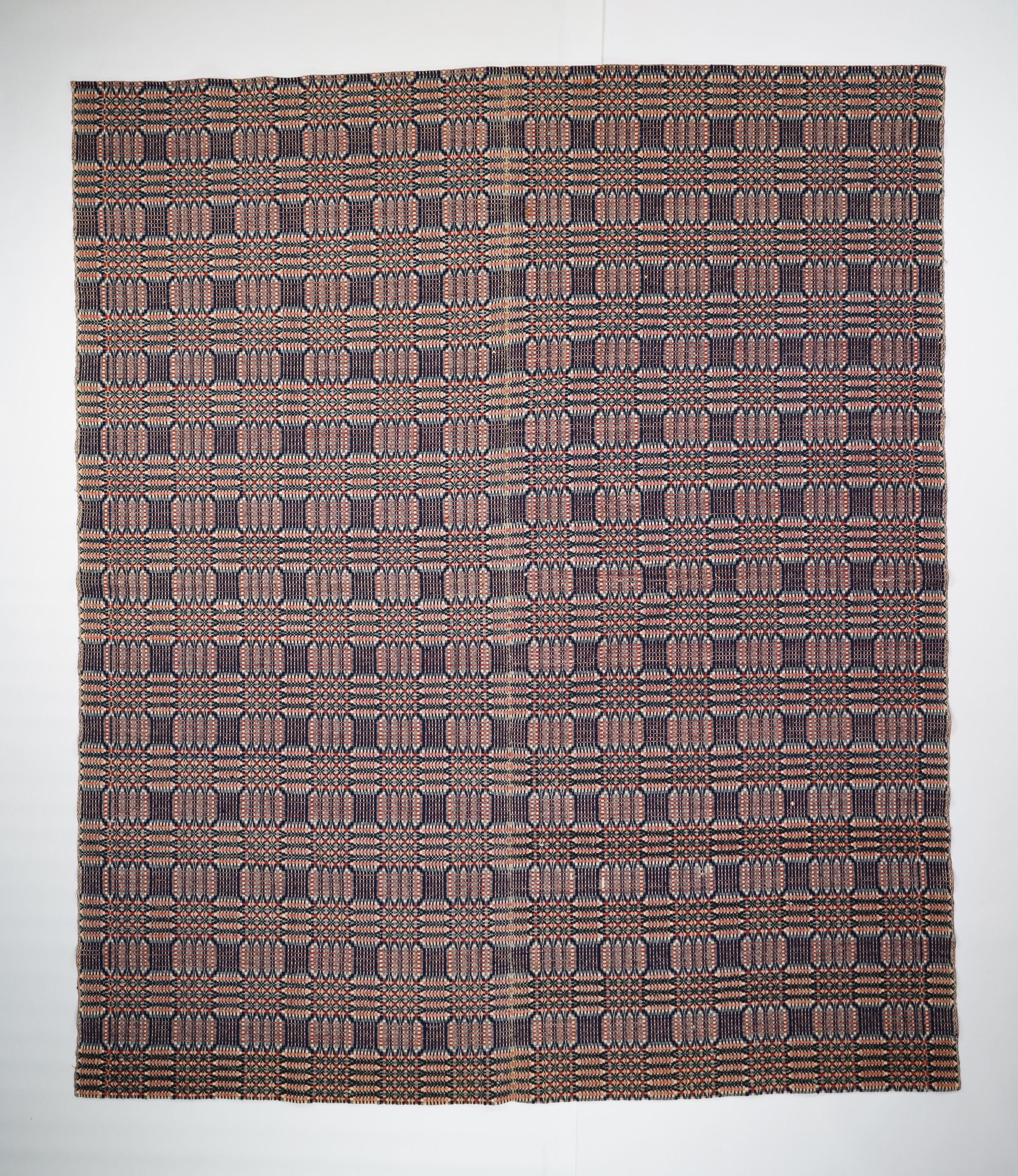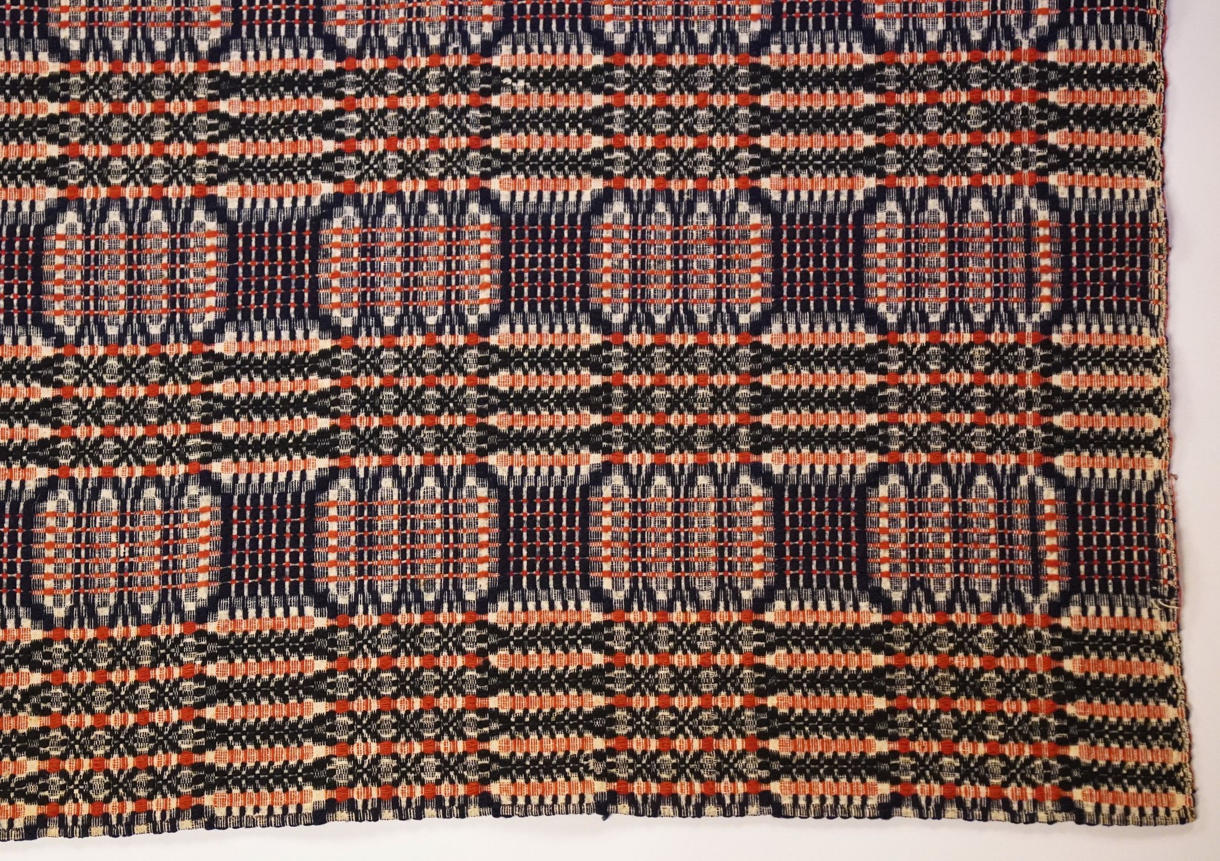 Red, navy, and natural geometric overshot coverlet with border along bottom. Two joined panels.