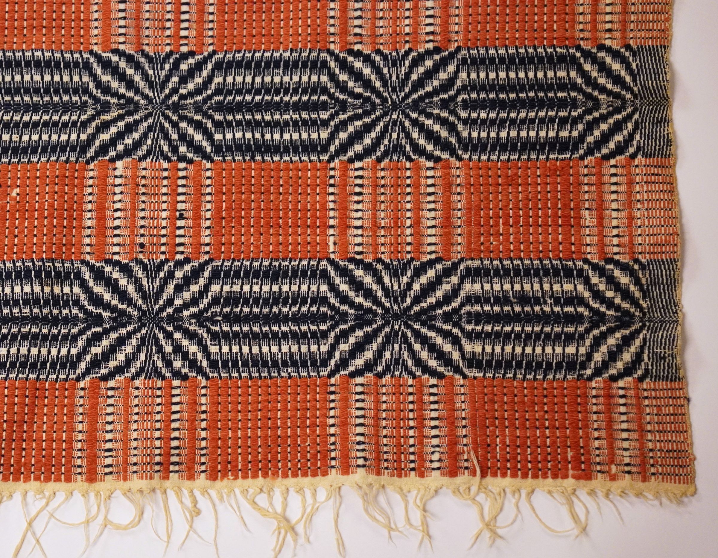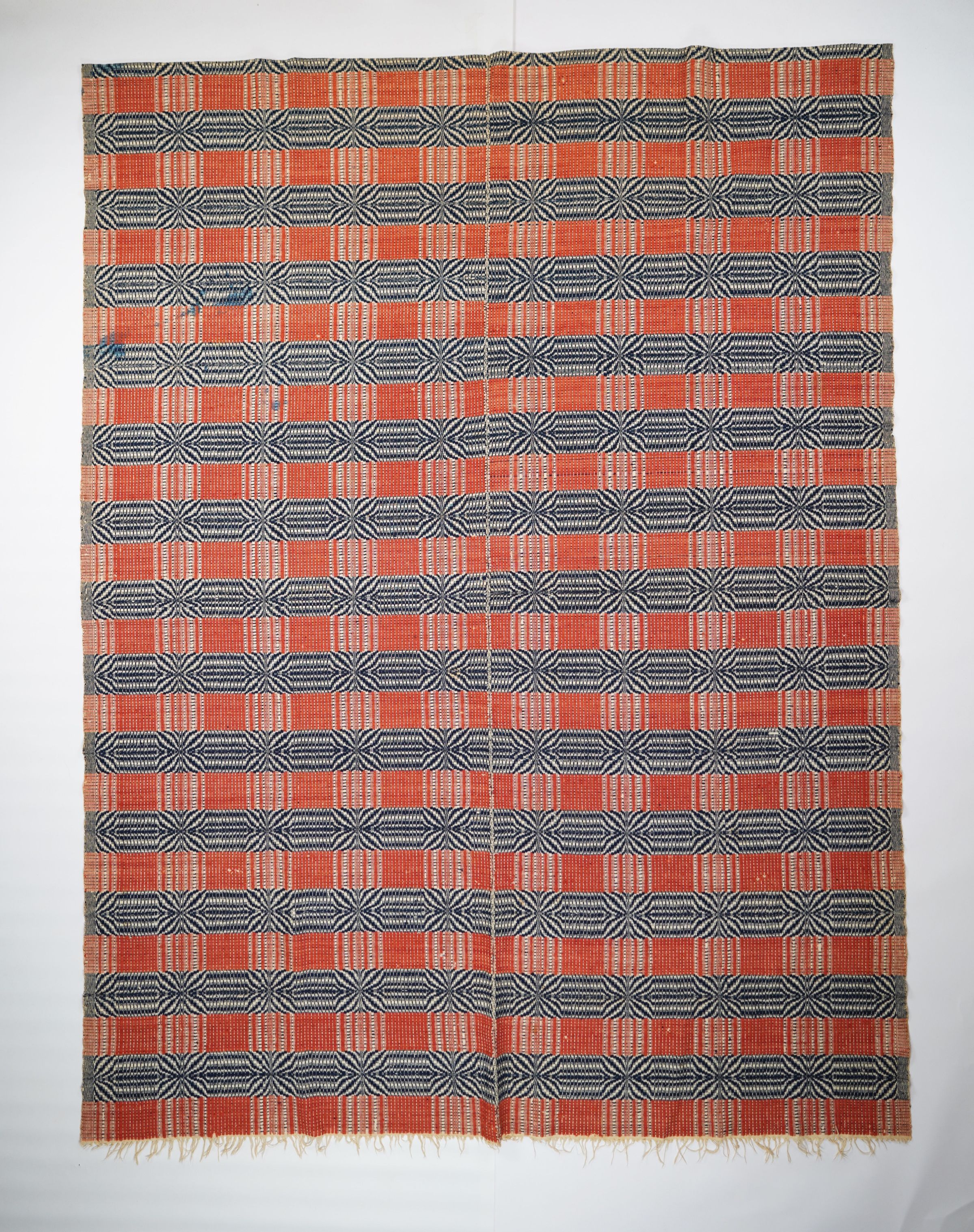 Red, navy, and natural geometric overshot coverlet with self-fringe along bottom and border on two sides. Two joined panels.Collection