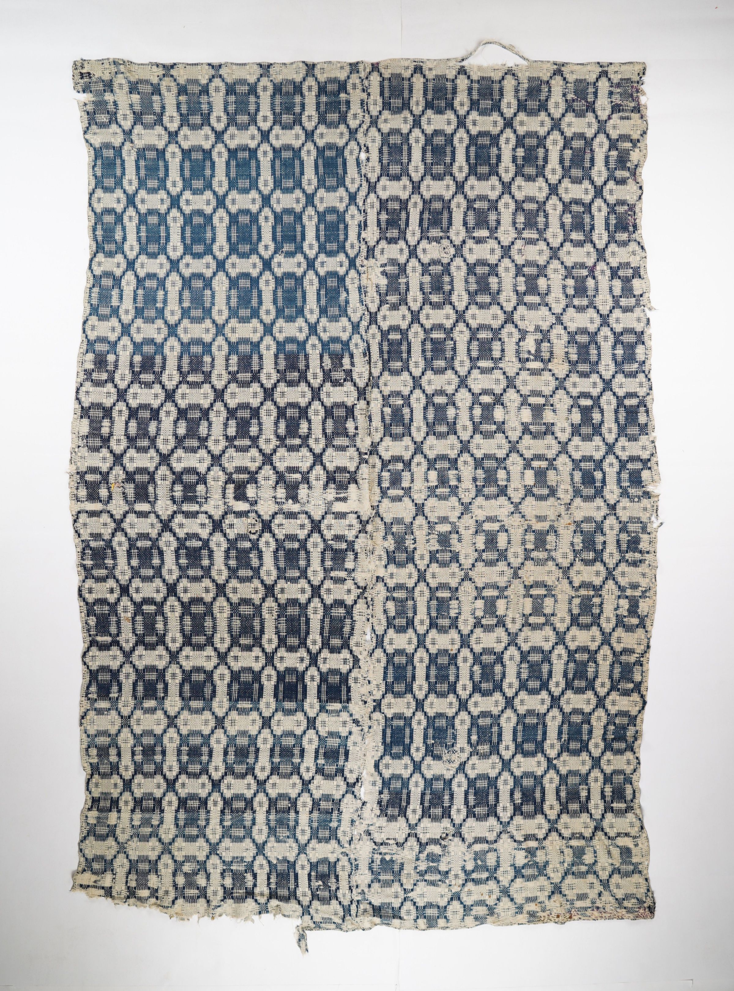 Geometric overshot coverlet with no fringe. Two panels joined by a center seam. Navy wool with undyed cotton. Abstract centerfield pattern. Unknown weaver.Context