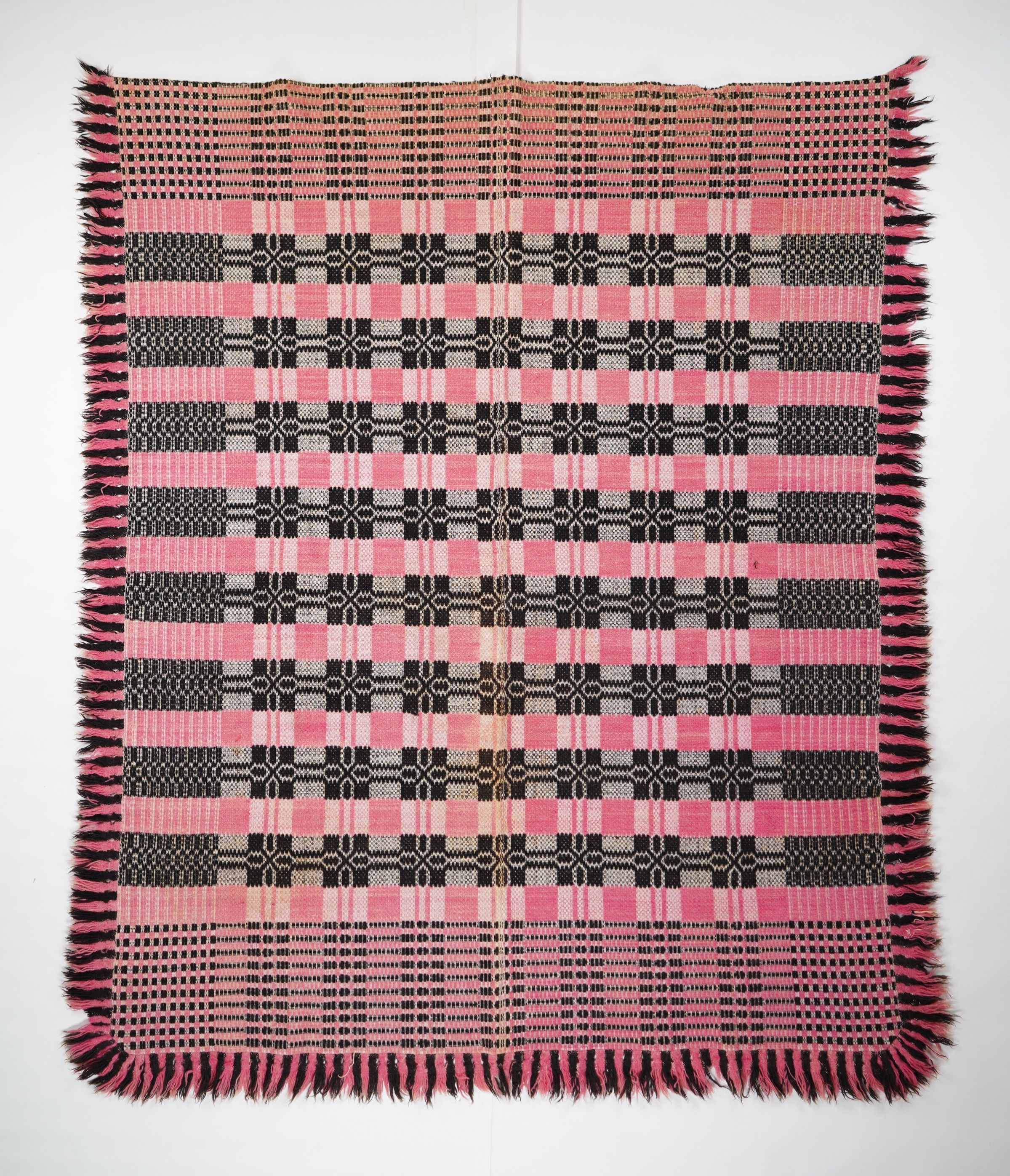 Pink, black, and natural geometric overshot coverlet with applied fringe on three sides and border on four sides.Collection