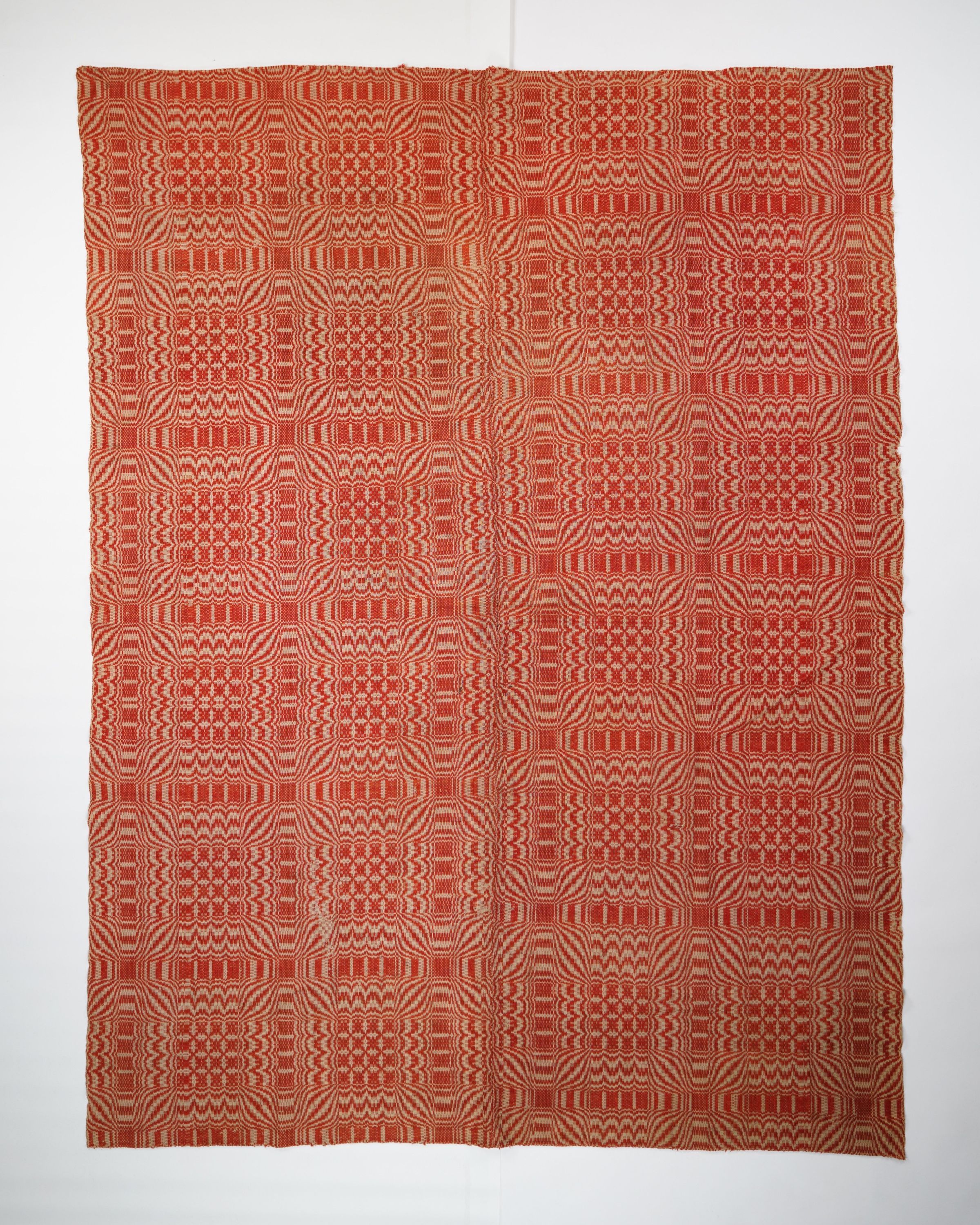 Red and natural geometric overshot coverlet. Two joined panels.