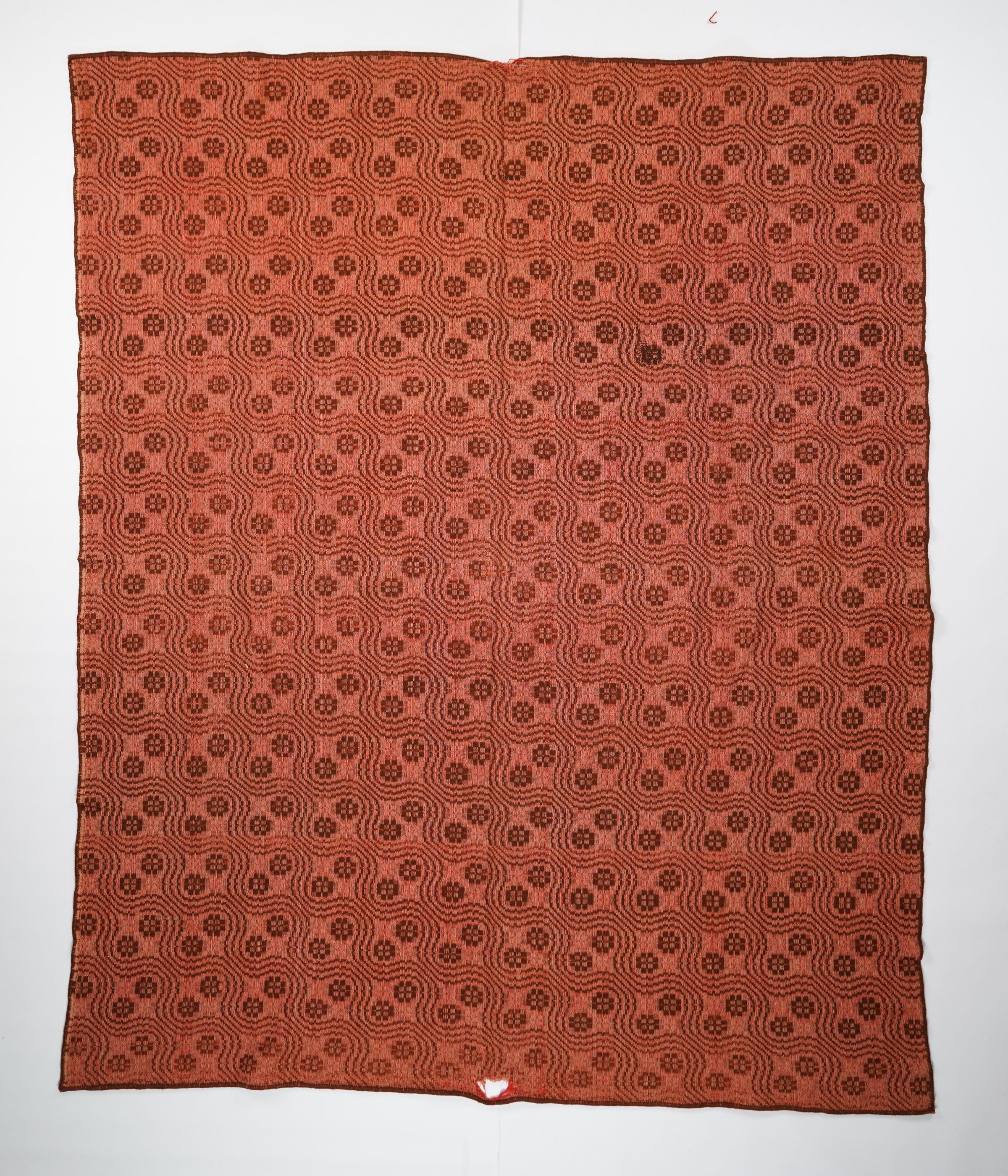 Red and brown geometric overshot coverlet in "Cat Track and Snail Trail" pattern. Two joined panels.