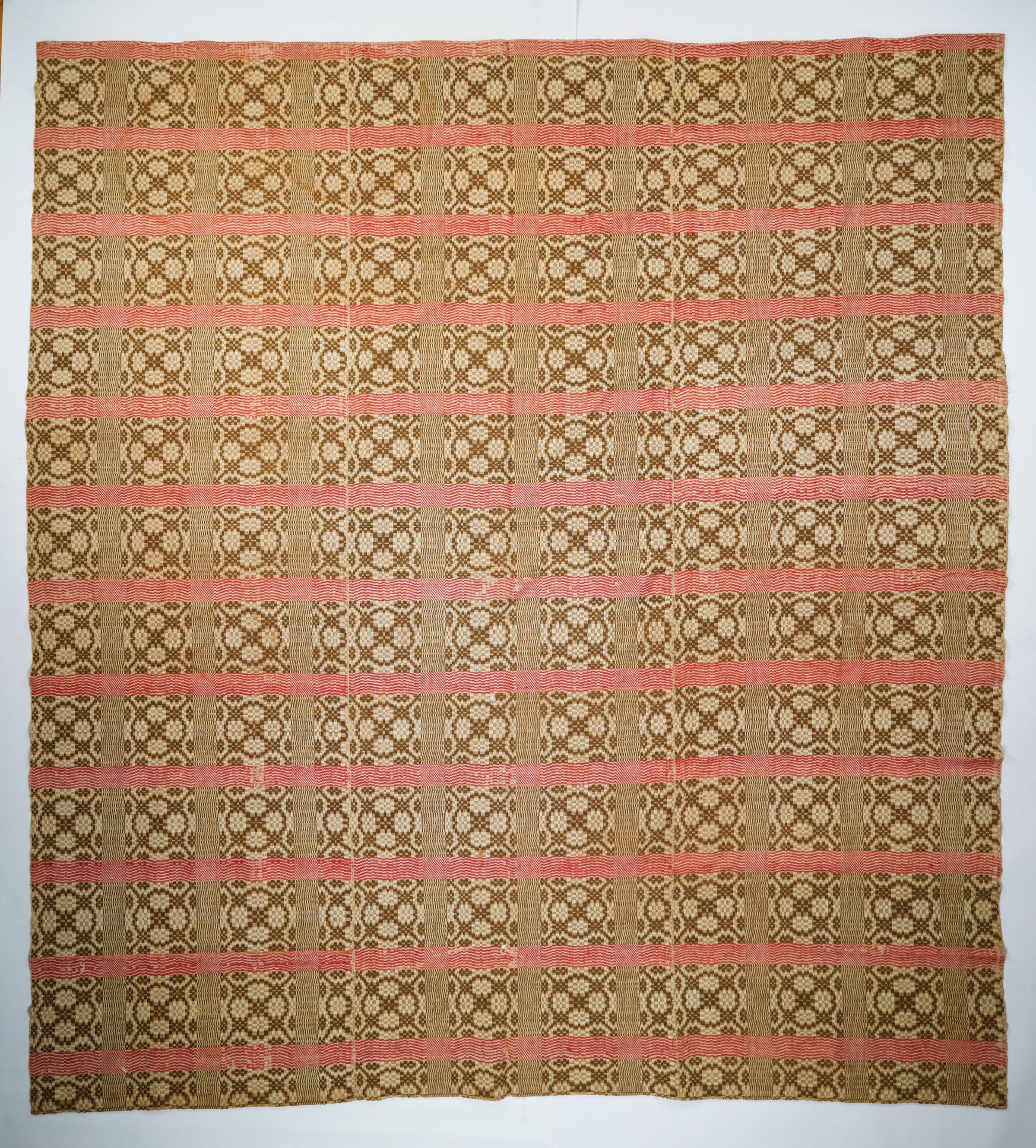 Red, burnt sienna, and natural geometric overshot coverlet. Two joined panels.