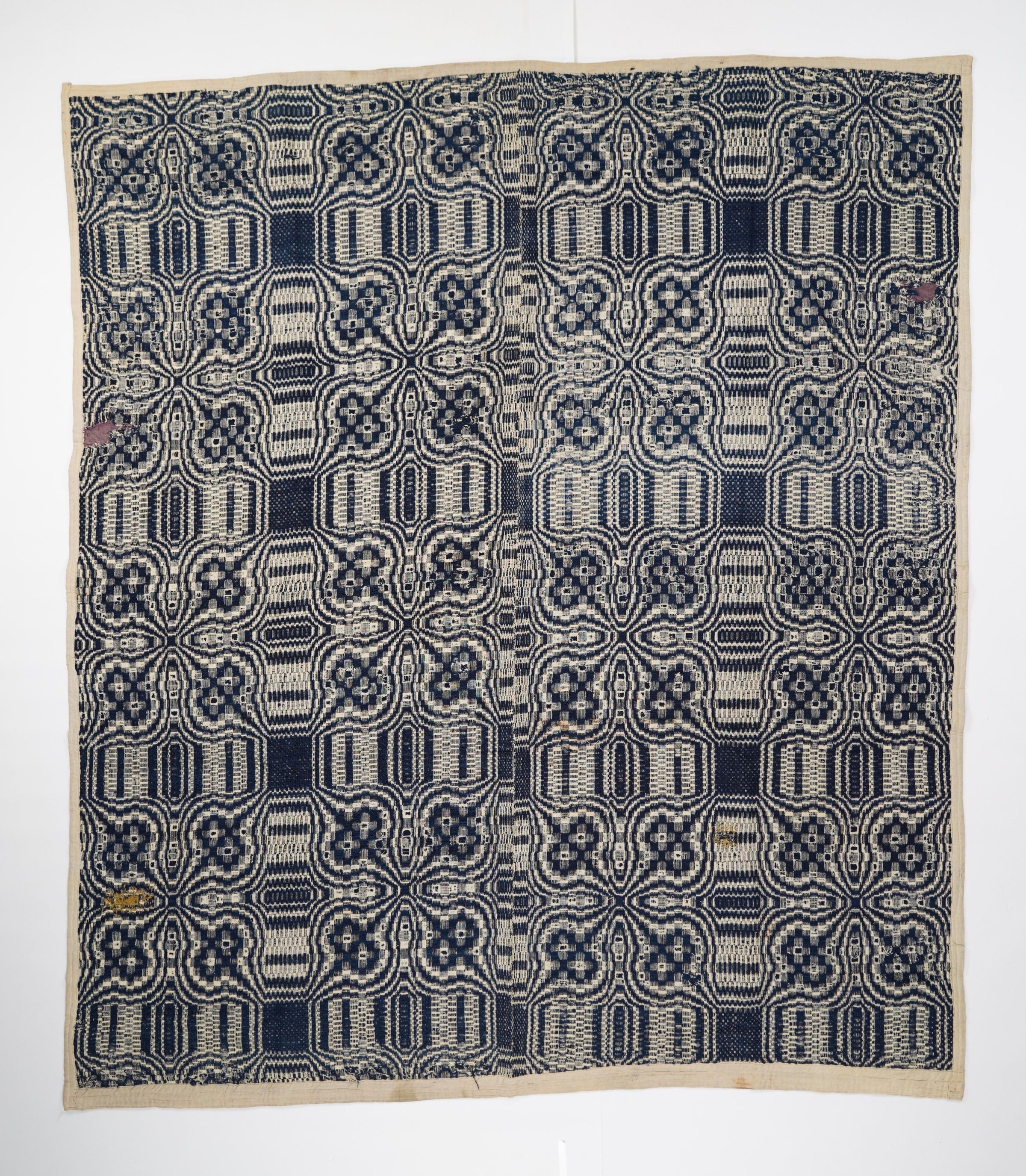 Navy and natural geometric overshot coverlet. Two joined panels. Note the dark yellow darning in the lower left area of the coverlet.Collection