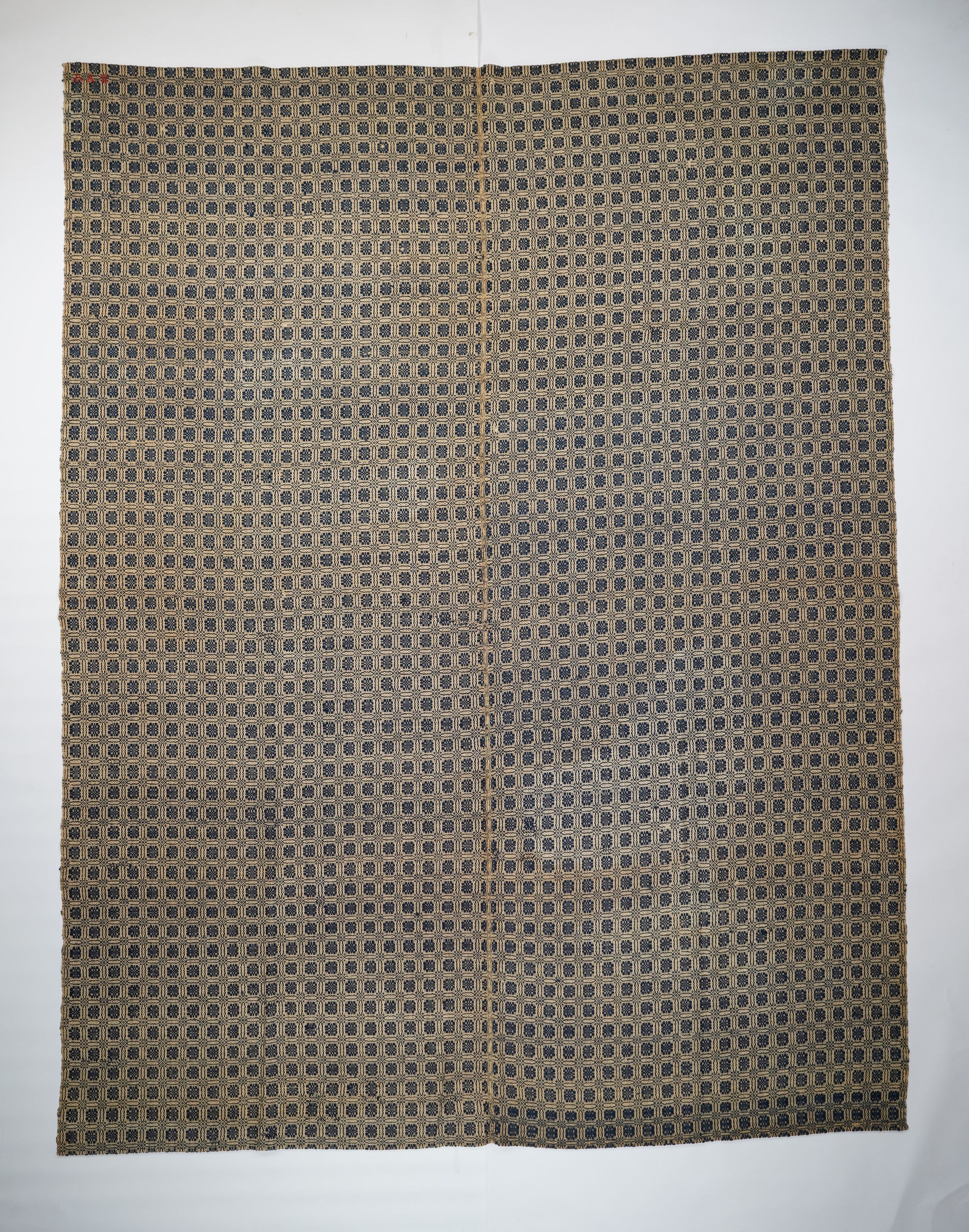 Navy and natural geometric overshot coverlet. Two joined panels.