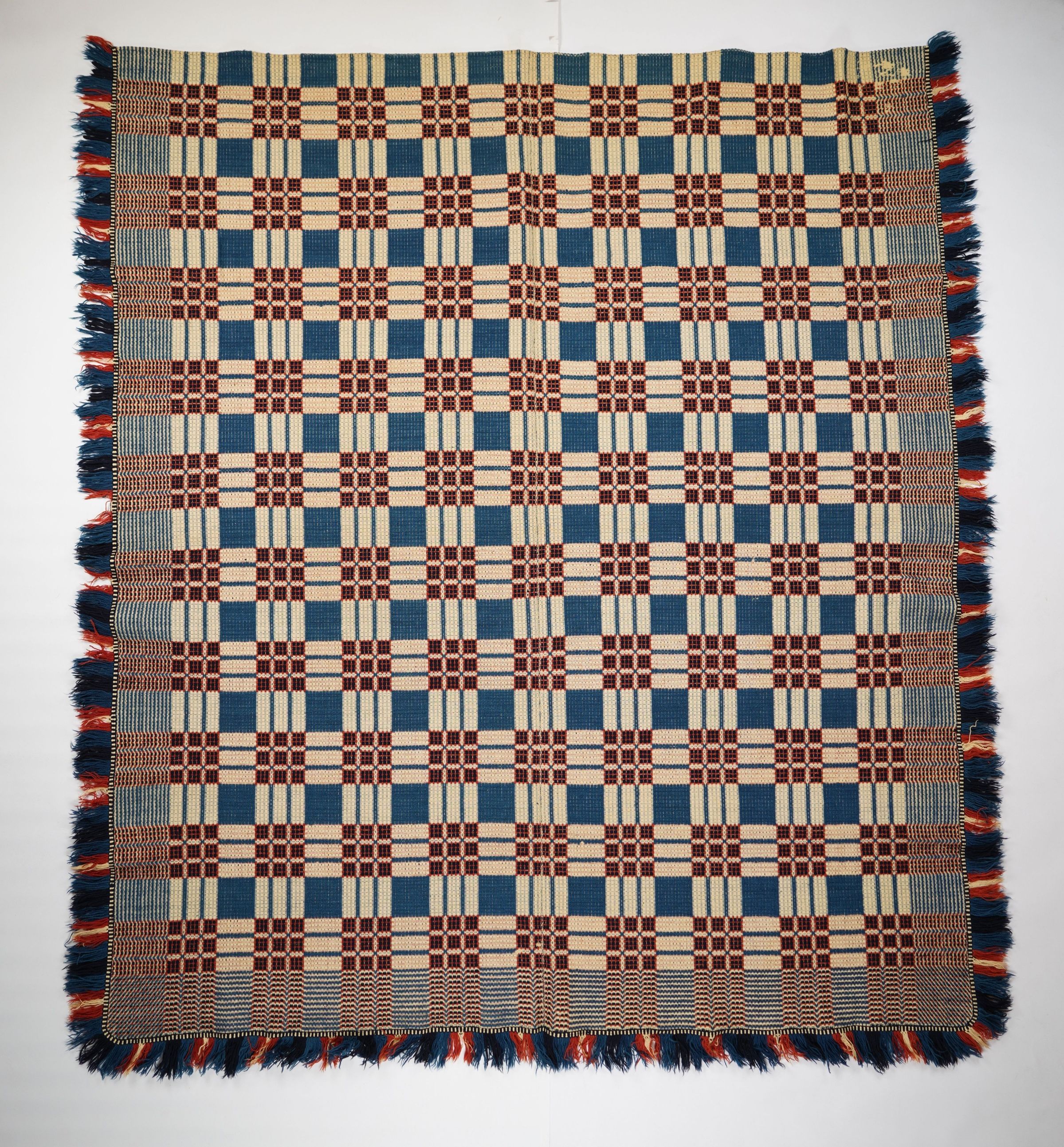 Red, navy, blue, and natural geometric overshot coverlet with border and applied fringe on three sides. Two joined panels.Collection
