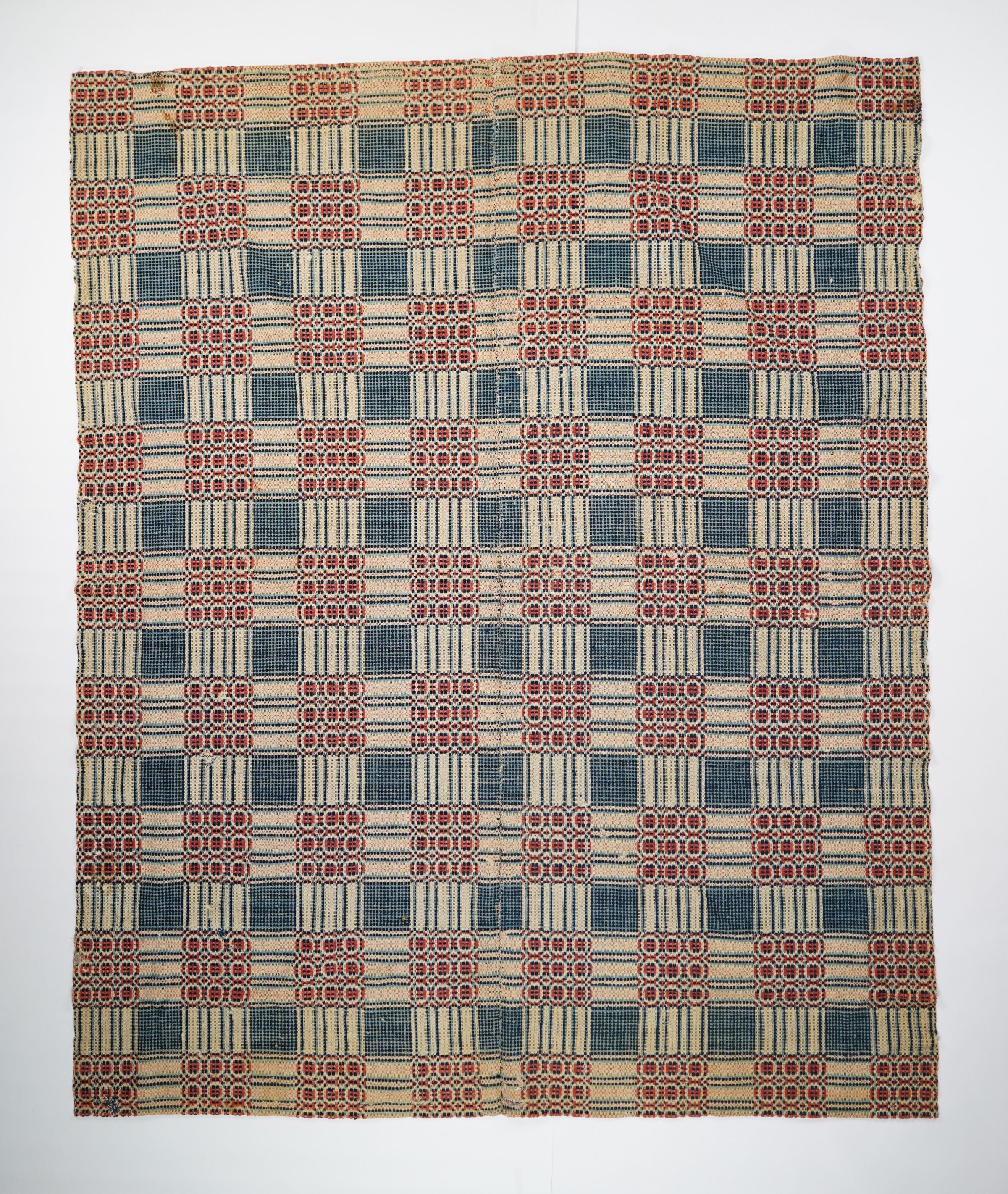 Red, blue, navy, and natural geometric overshot coverlet. Two joined panels.