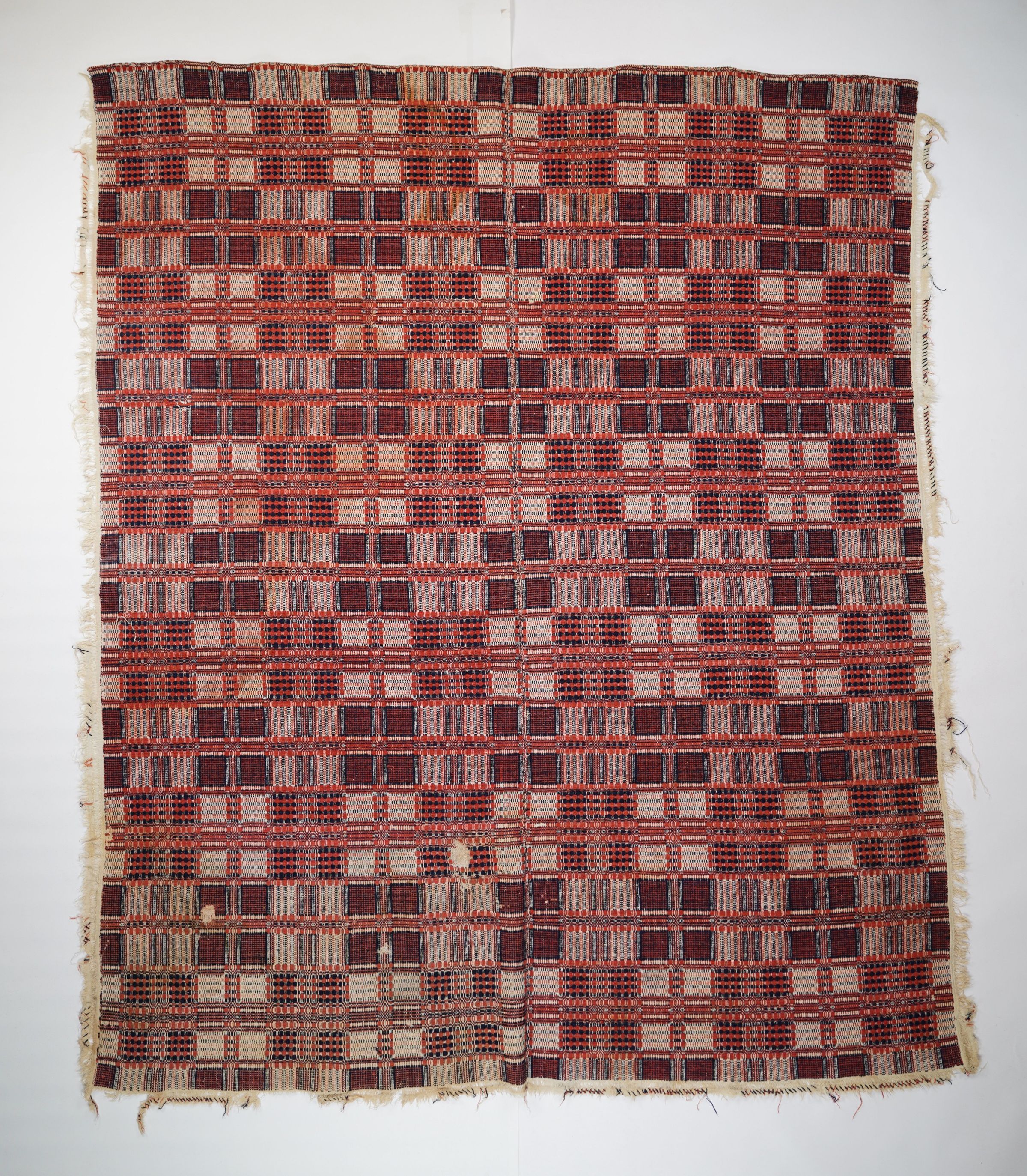 Red, navy, and natural geometric overshot coverlet with self-fringe on three sides.