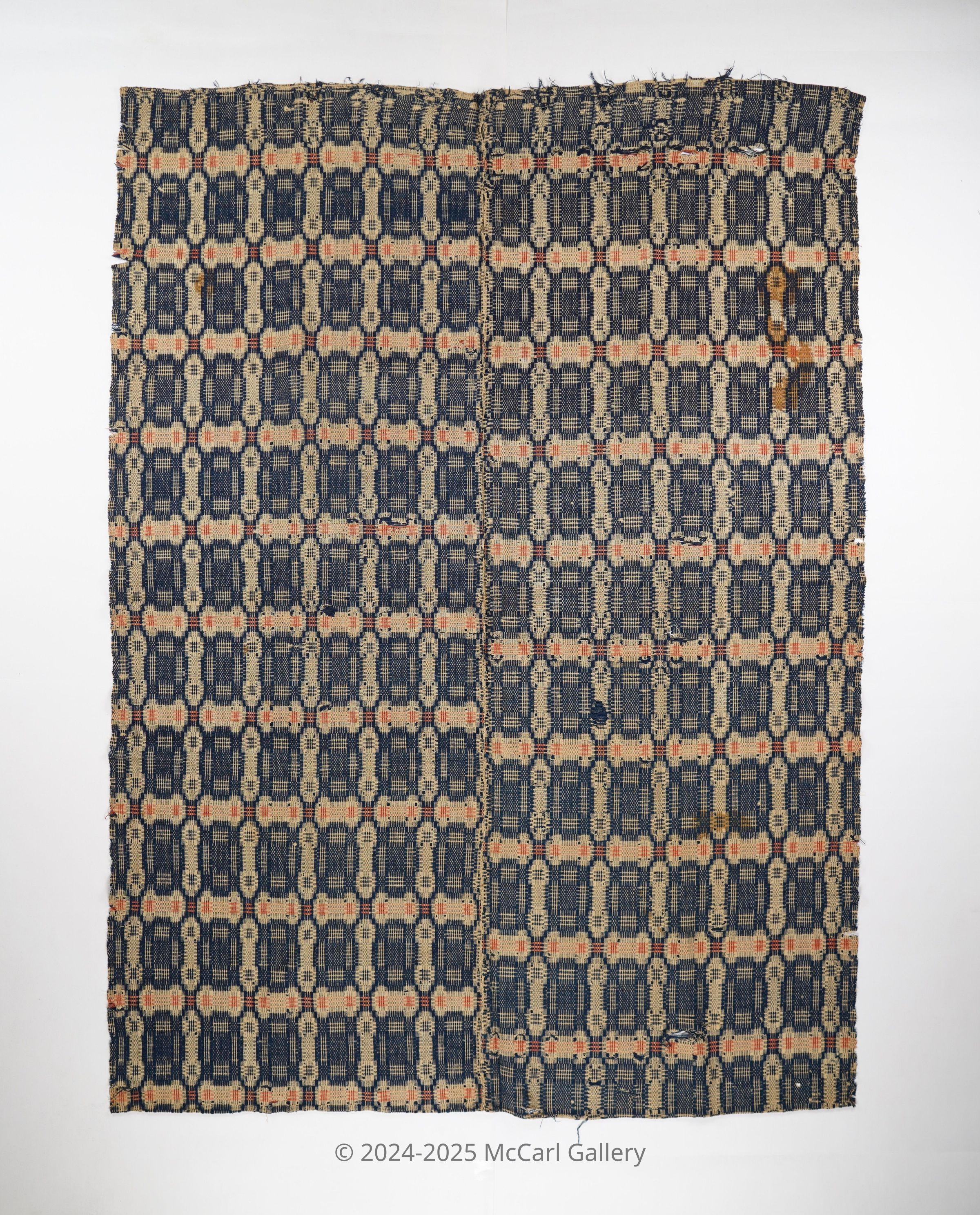 Geometric overshot coverlet with no fringe. Two panels joined by a center seam. Navy and red wool with undyed cotton. Catalpa centerfield pattern. Unknown weaver.Collection