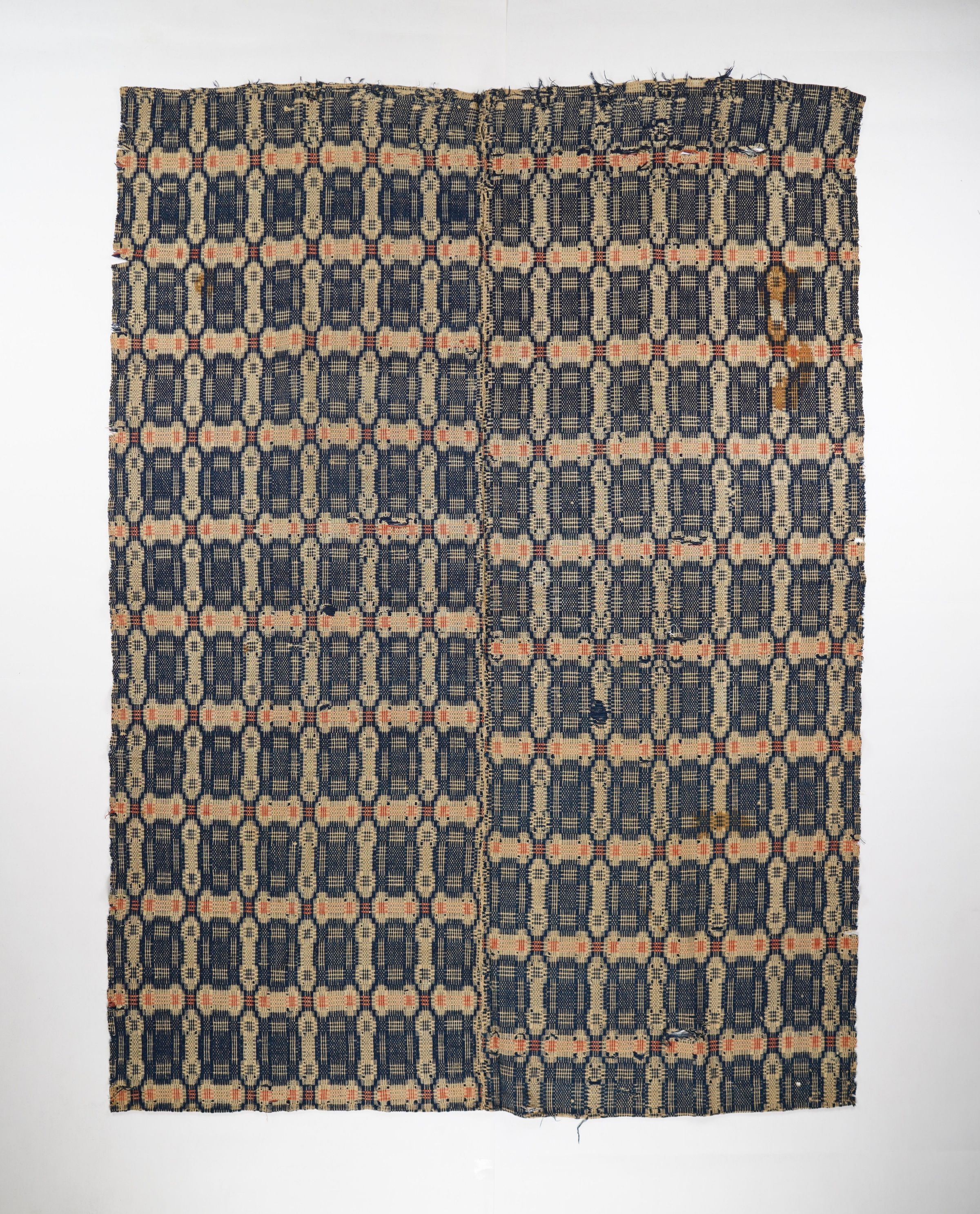 Geometric overshot coverlet with no fringe. Two panels joined by a center seam. Navy and red wool with undyed cotton. Catalpa centerfield pattern. Unknown weaver.Context