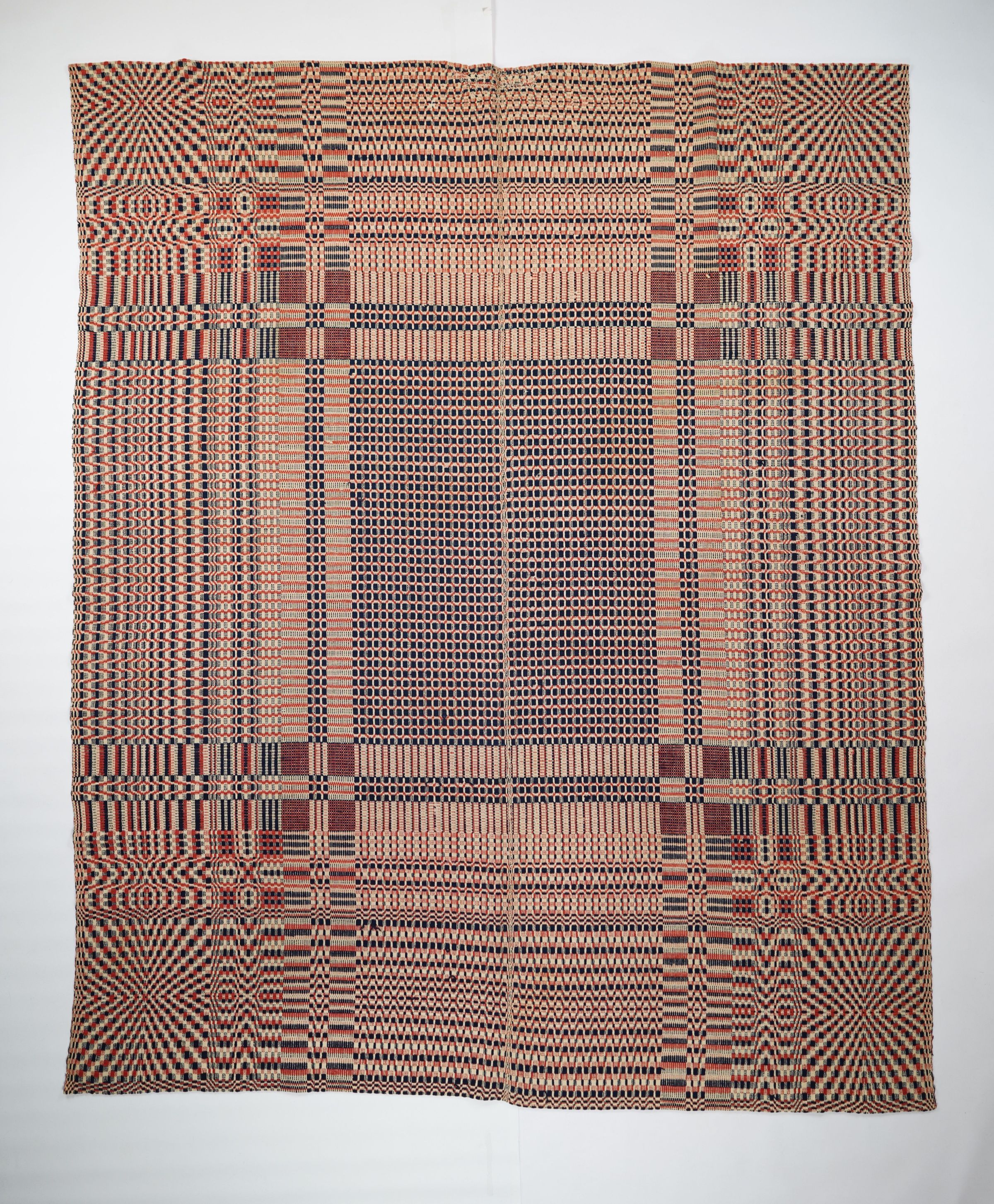 Red, navy, and natural geometric overshot with border on four sides. Two joined panels.