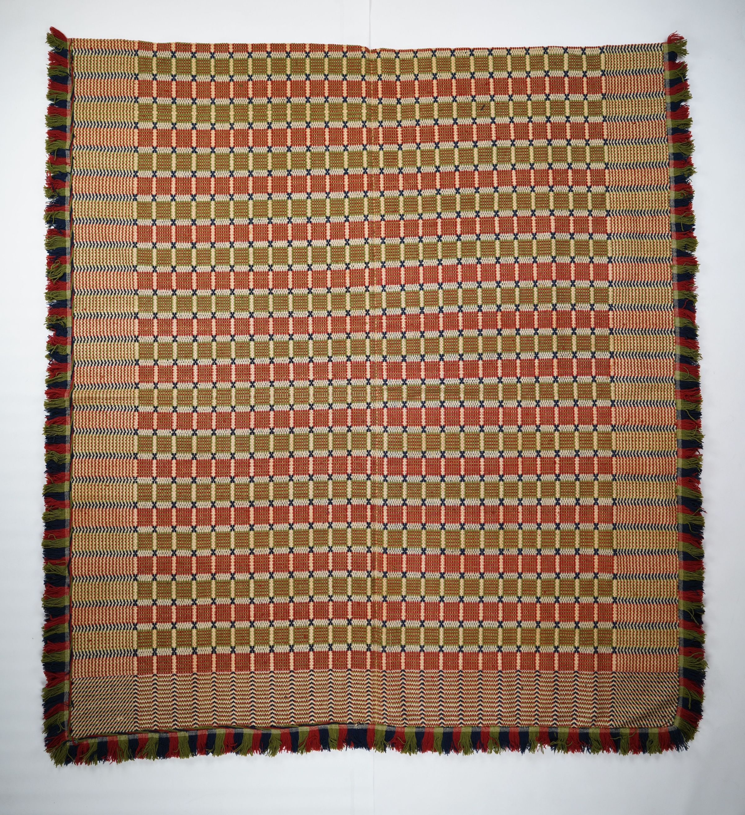 Red, navy, green, and natural geometric overshot coverlet with border and applied fringe on three sides. Two joined panels.Collection