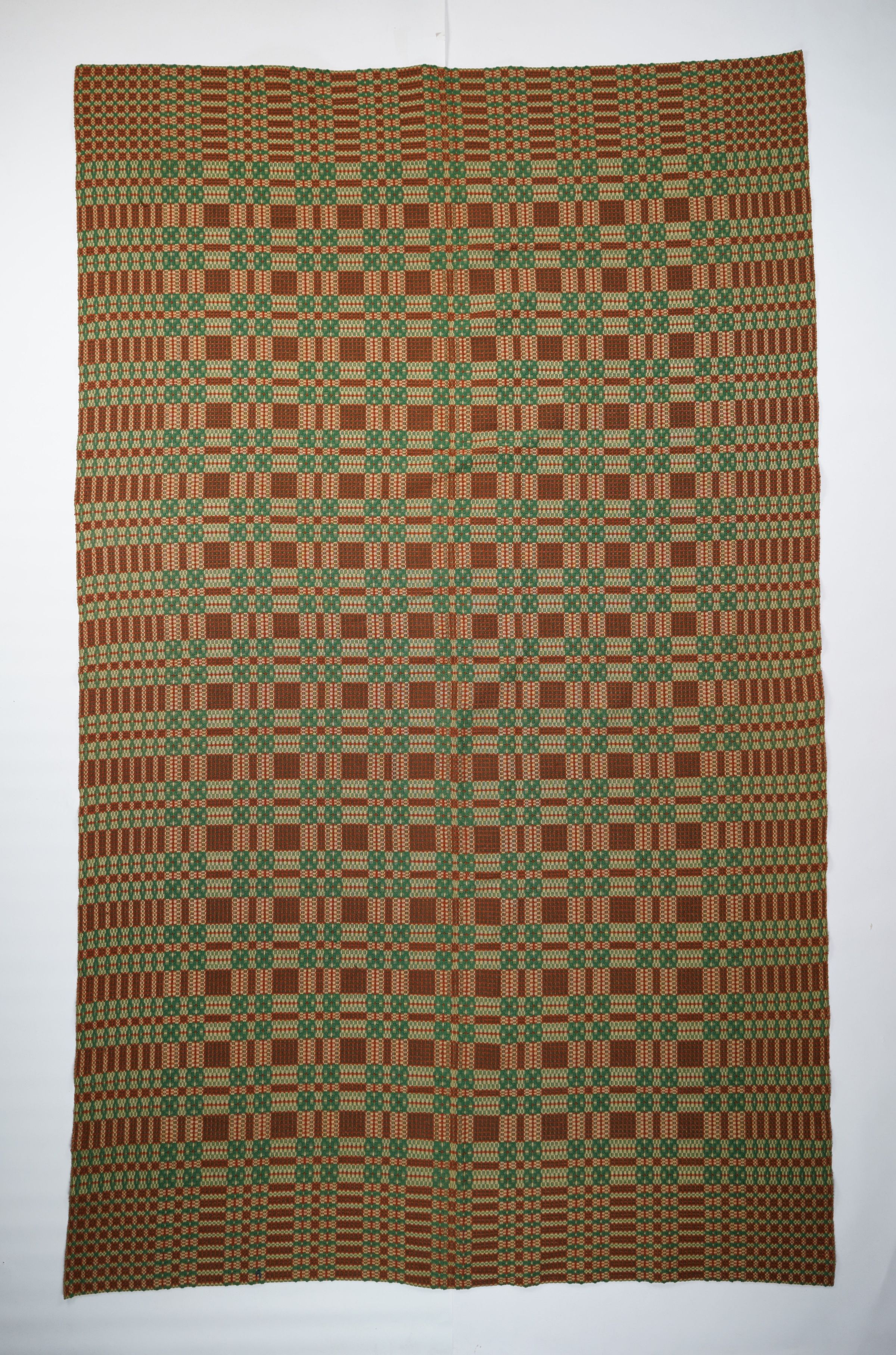 Red, green, brown, and natural coverlet with border on four sides. Seamless.