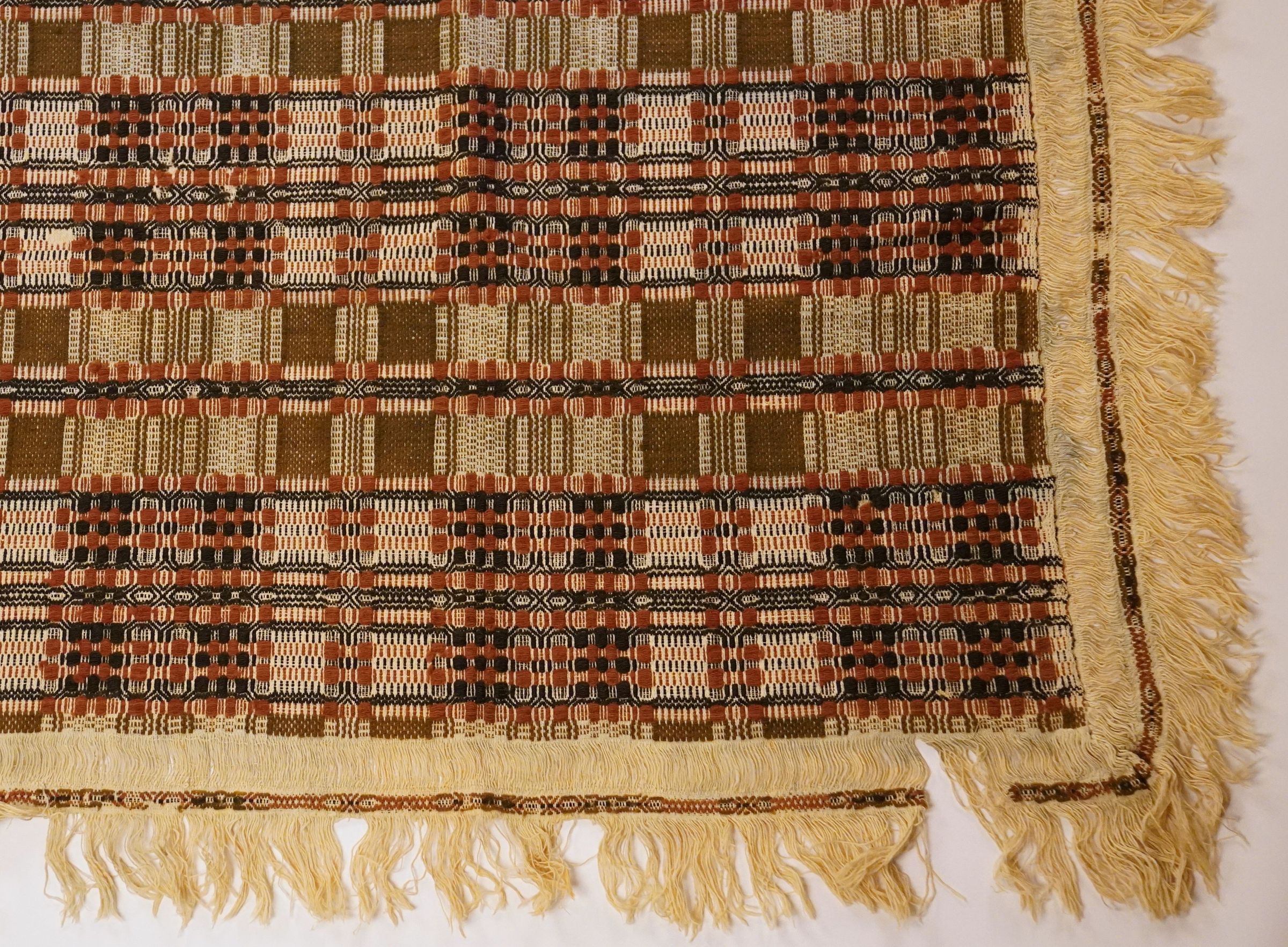 Red, navy, natural, and burnt sienna geometric overshot coverlet with fringe and border on three sides. Two joined panels.Collection