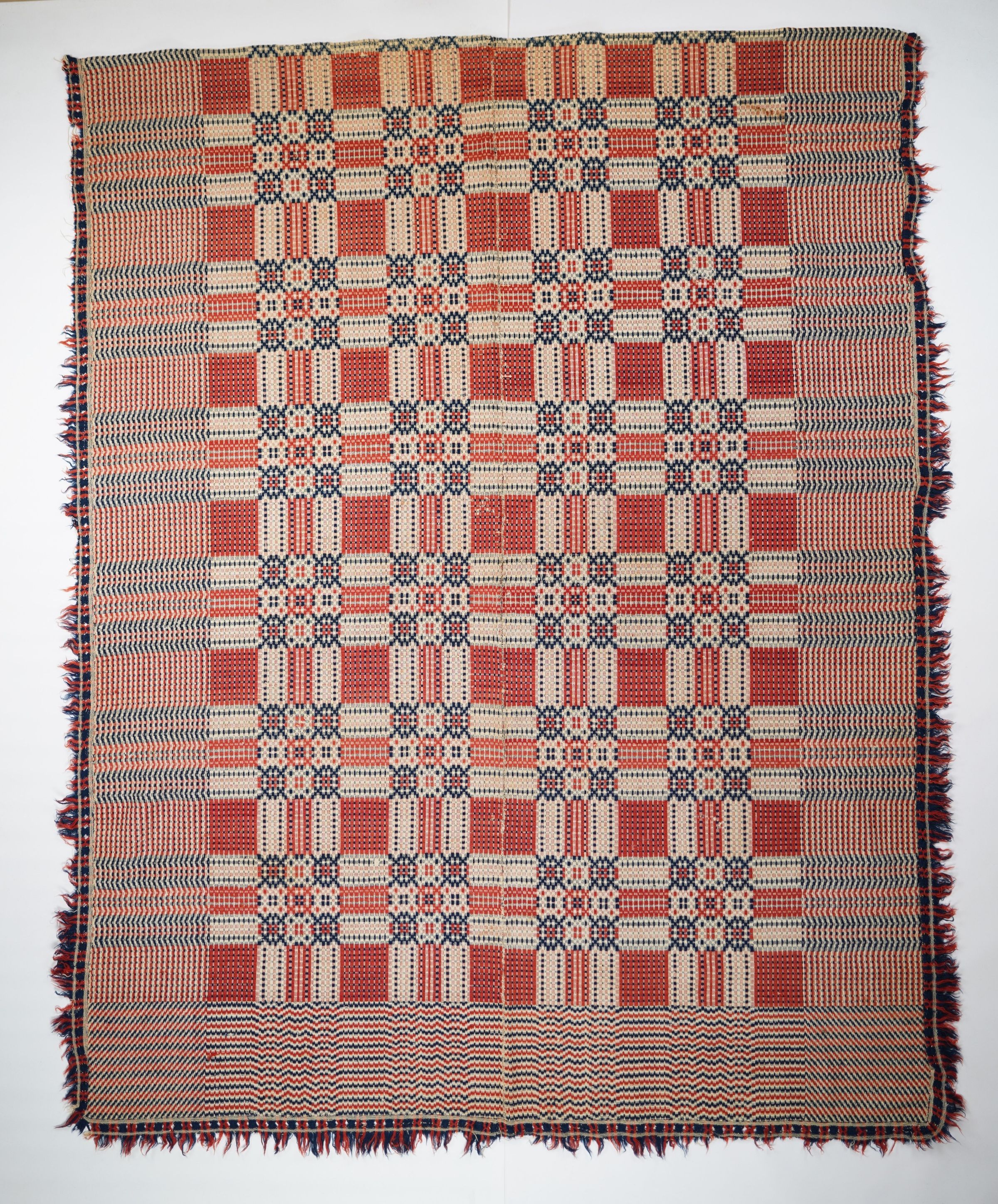 Red, navy, and natural geometric overshot coverlet with applied fringe and border on three sides. Two joined panels.