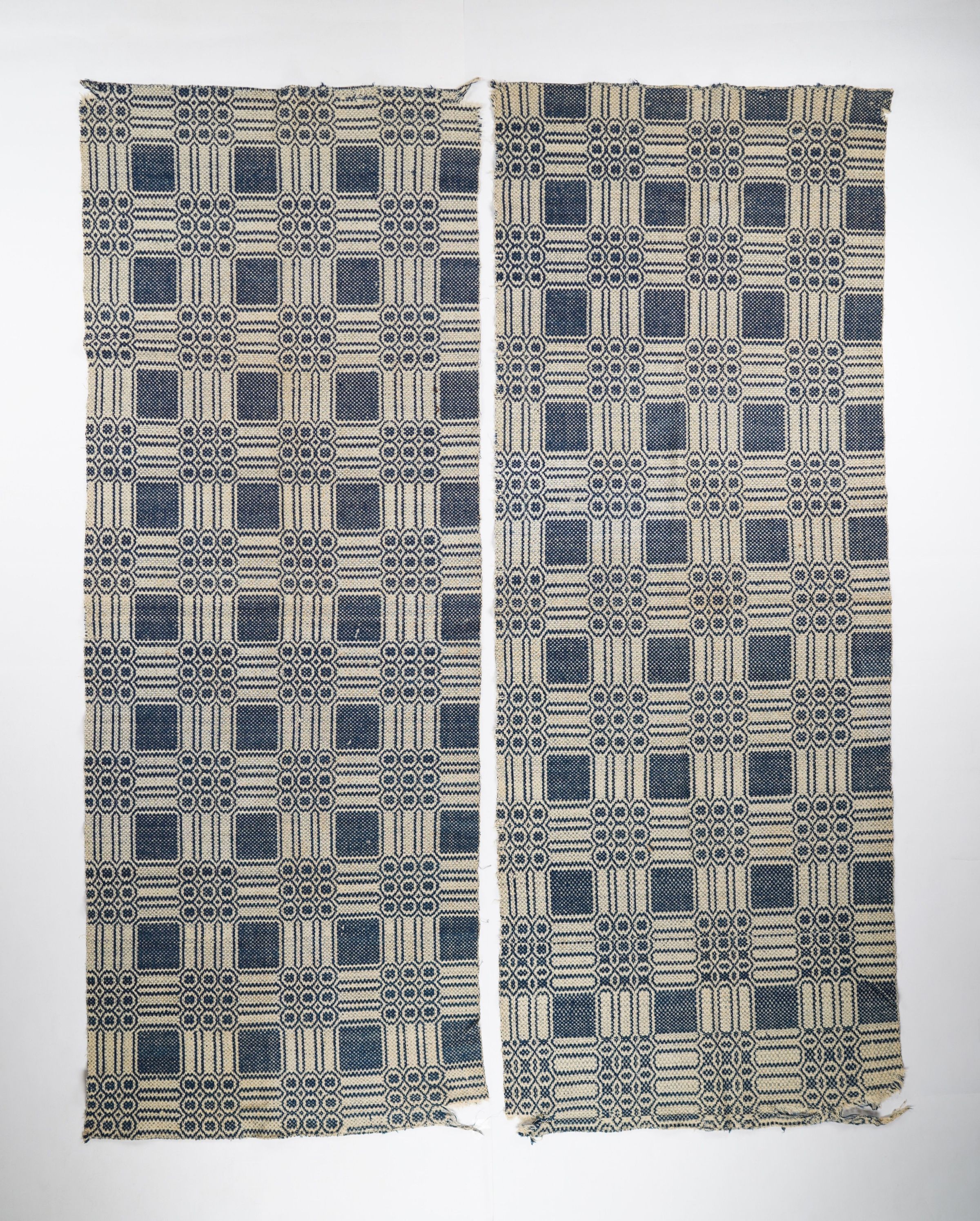 Geometric overshot coverlet with no fringe. Two seperate panels. Navy wool with undyed cotton. Abstract centerfield pattern. Unknown weaver.Context