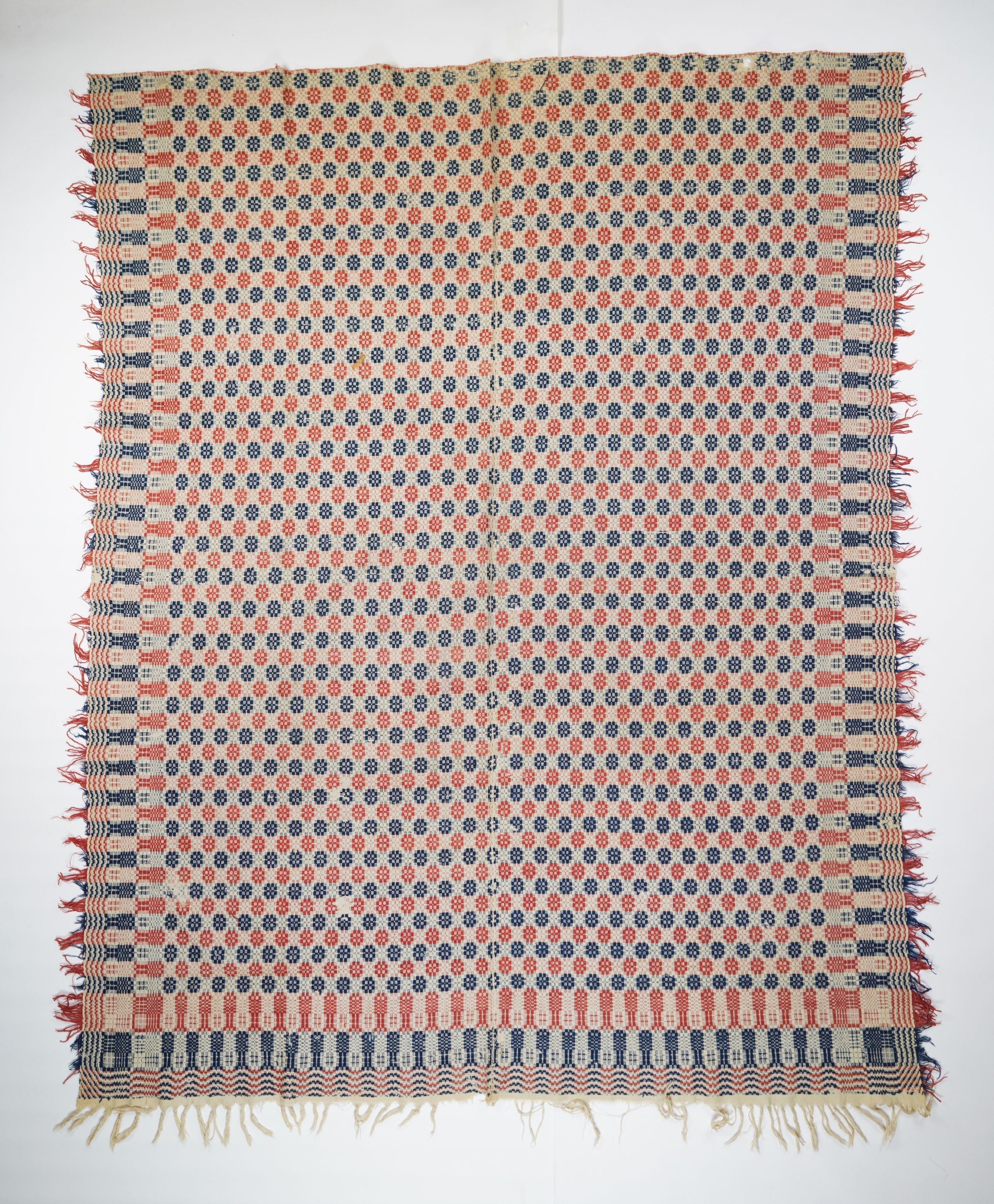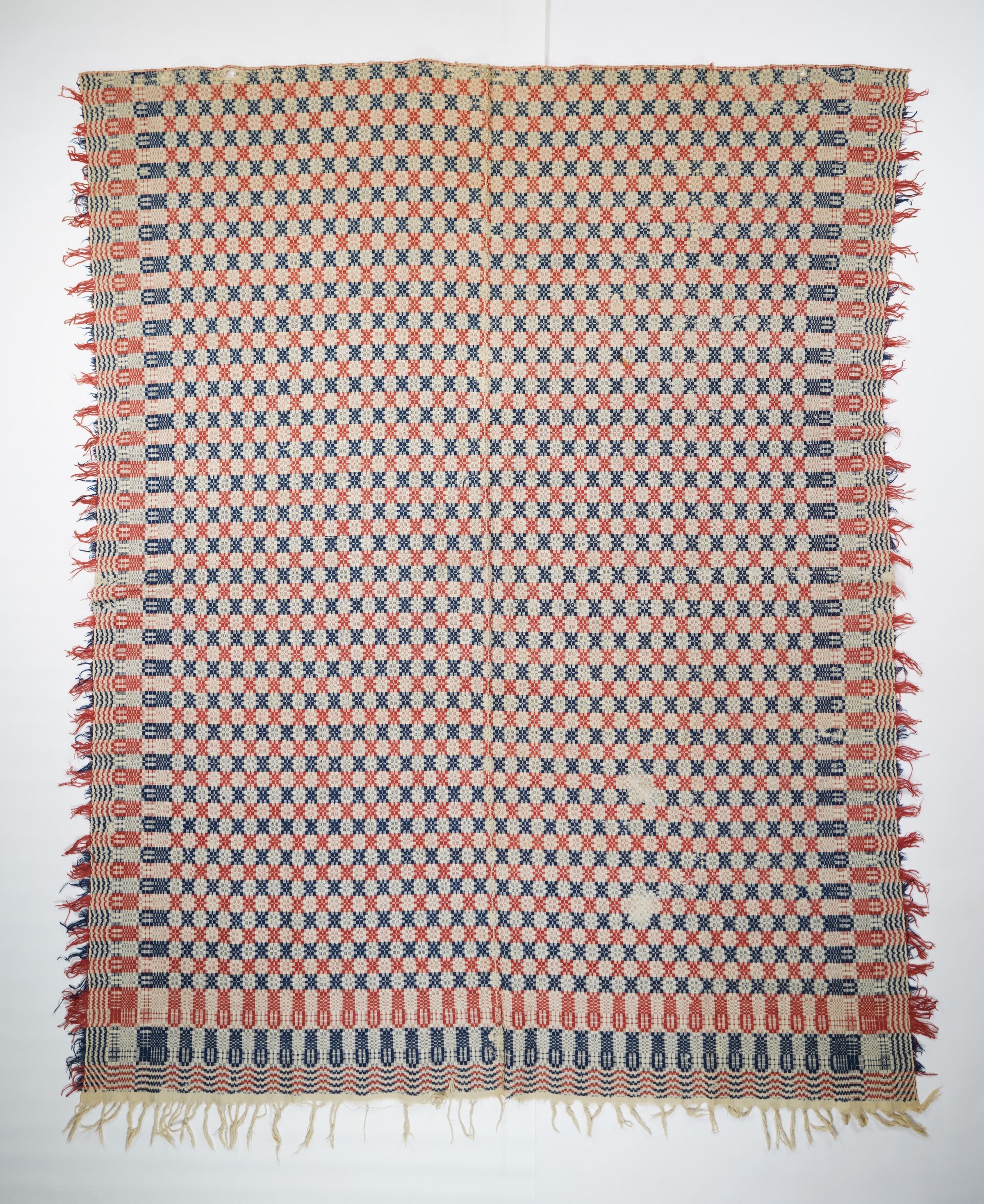 Red, navy, and natural geometric overshot coverlet with self-fringe and border on three sides. Two joined panels.