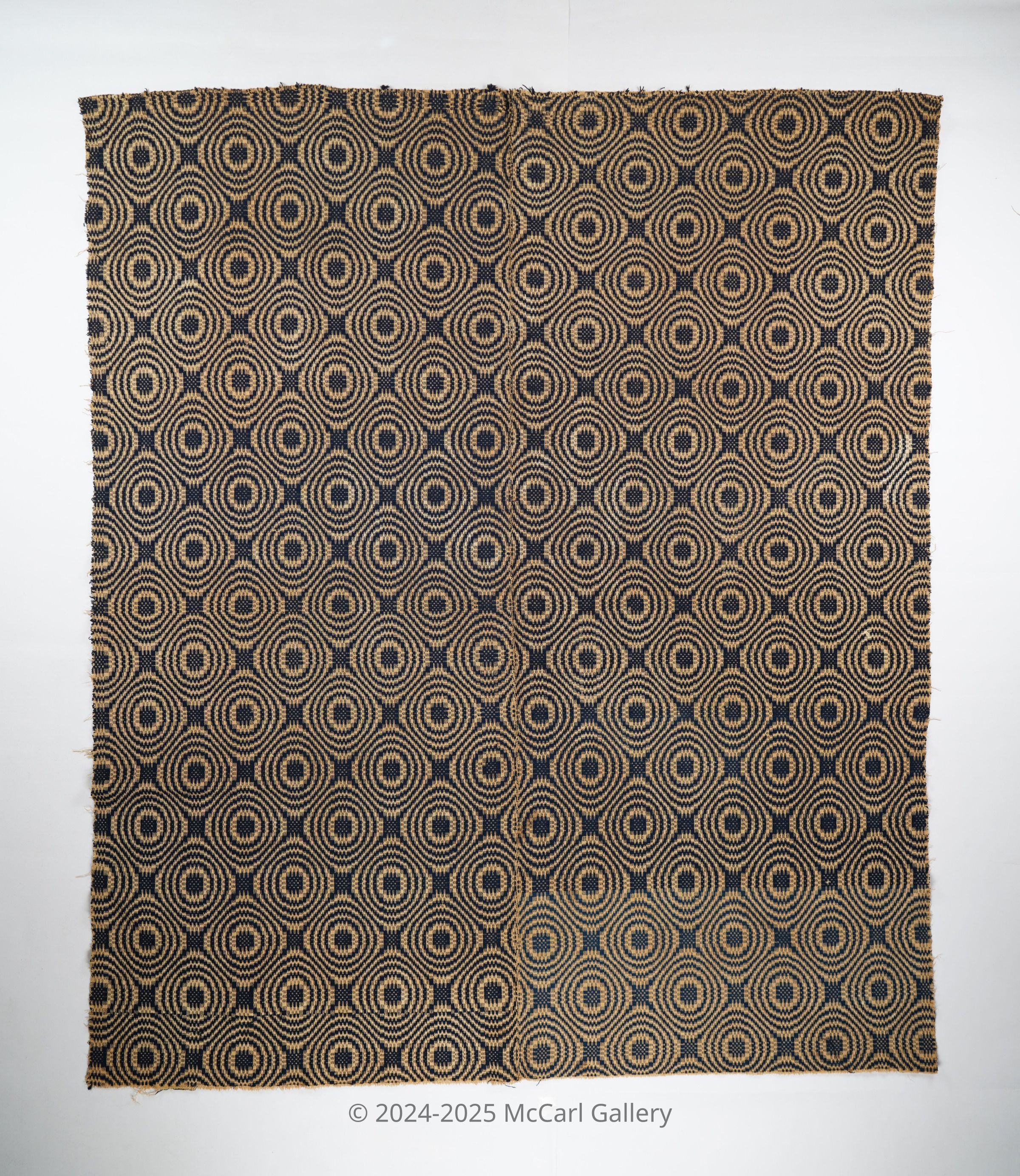 Geometric overshot coverlet with no fringe. Two panels joined by a center seam. Navy wool with undyed cotton. Wheel of fortune centerfield pattern. Unknown weaver.Collection