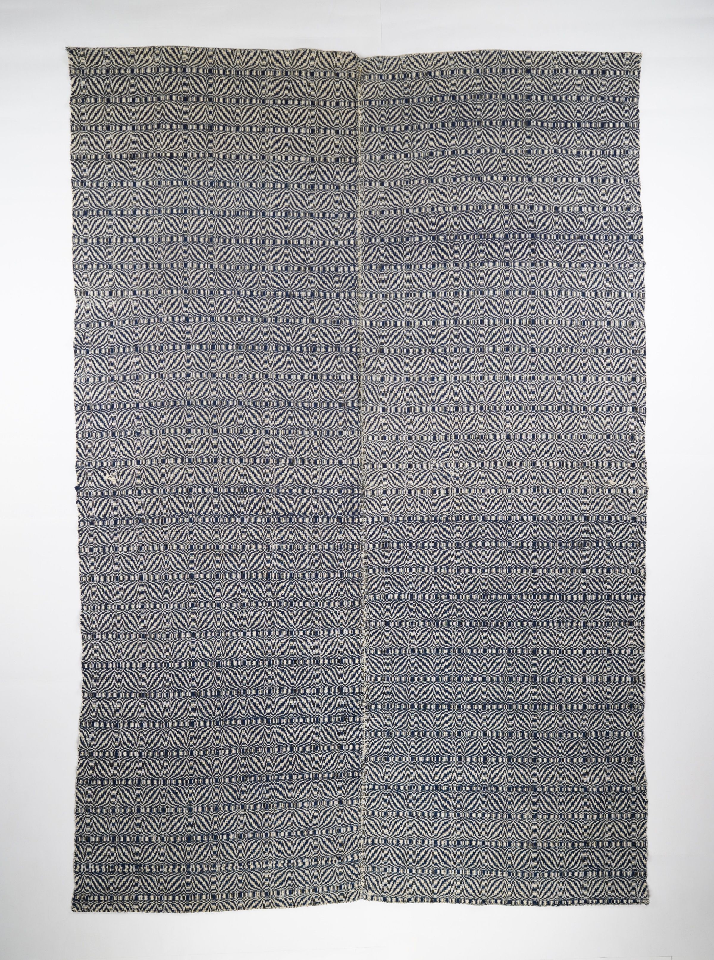 Navy and natural geometric overshot coverlet. Two joined panels. Double bowknot pattern.Context