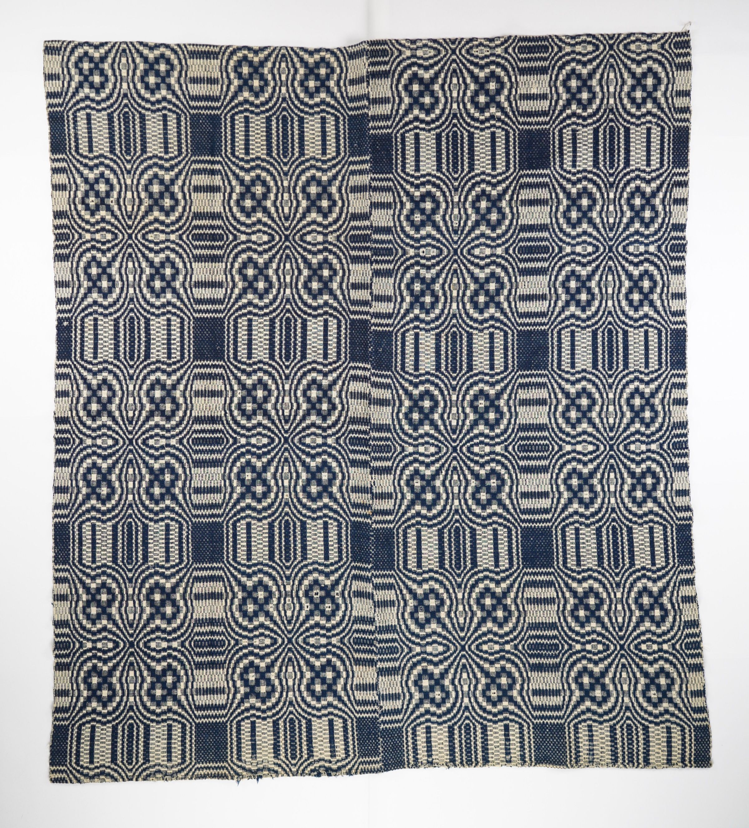 Navy and natural geometric overshot coverlet.