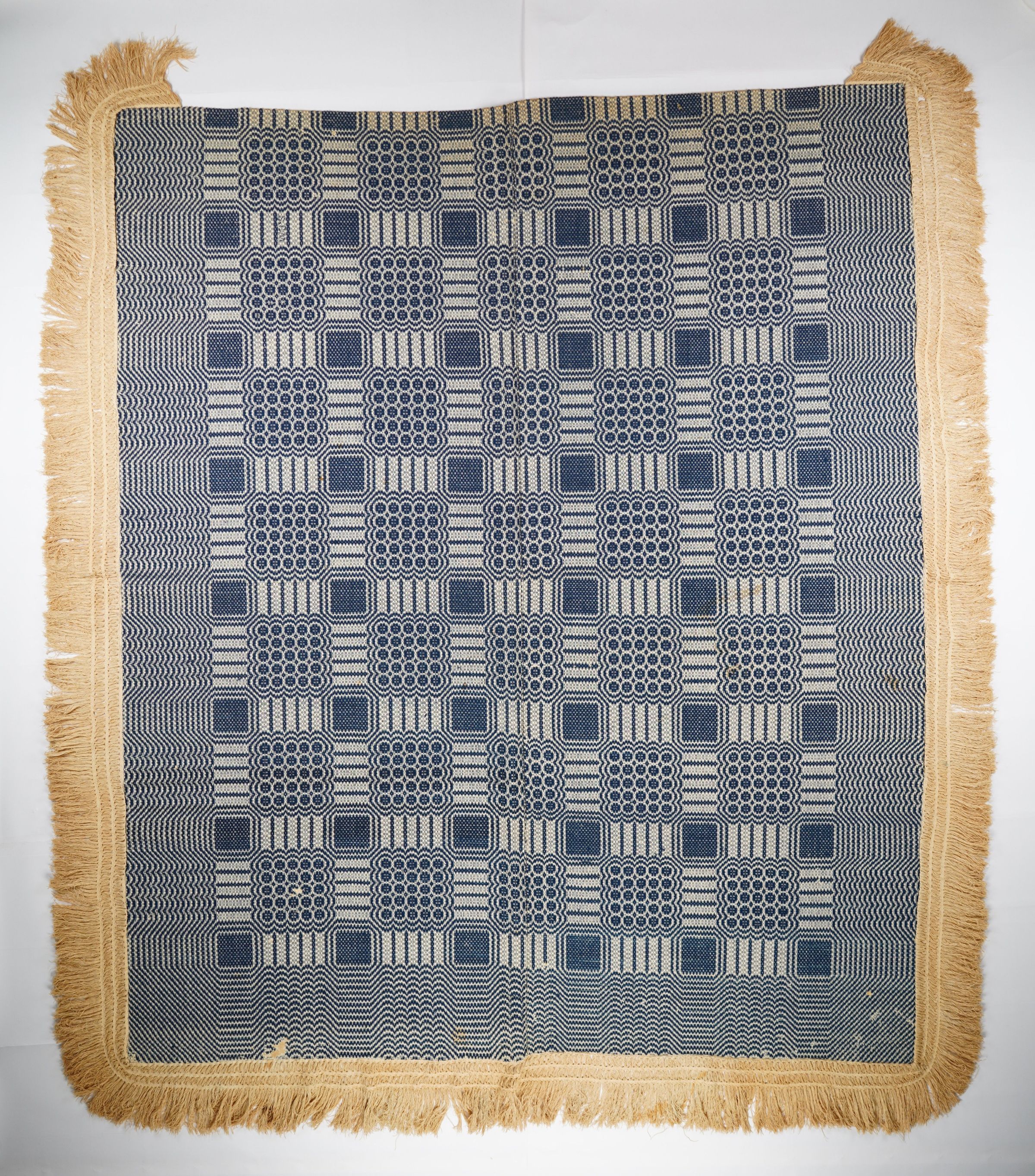 Geometric overshot coverlet with borders on 3 sides and applied fringe on sides and bottom. Two panels joined by a center seam. Navy wool with undyed cotton. Abstract centerfield pattern; abstract border on sides and bottom. Unknown weaver.Context