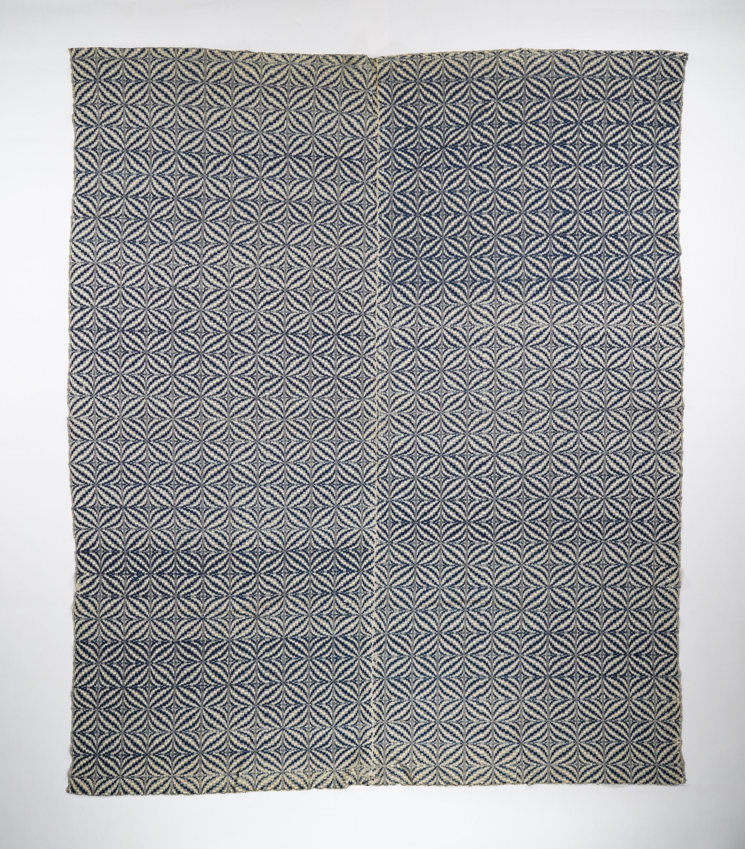 Navy and natural geometric overshot coverlet. Two joined panels. Star of Bethlehem type pattern.Context