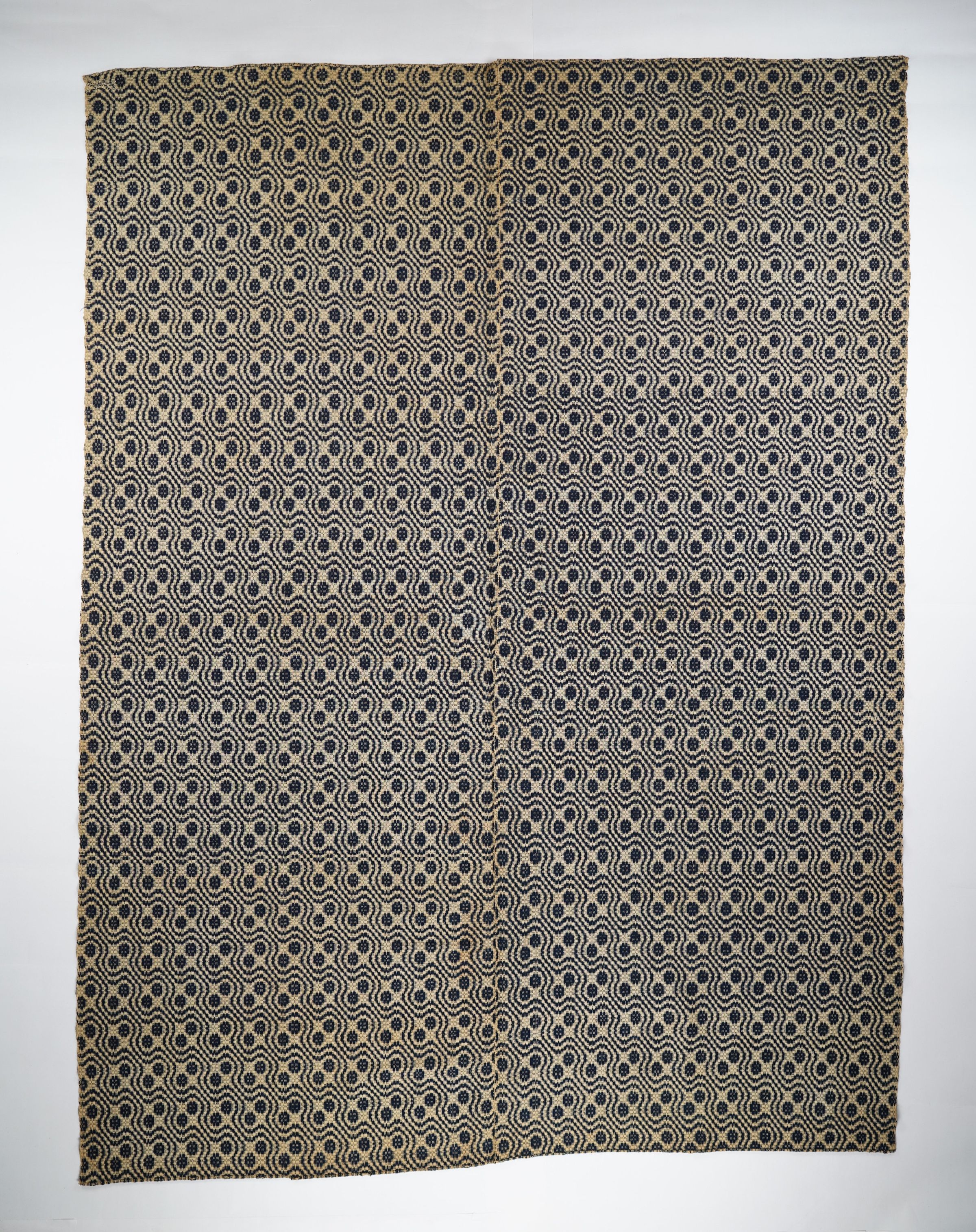Navy and natural geometric overshot coverlet. Two joined panels. Miniature cat track and snail trail pattern.Context