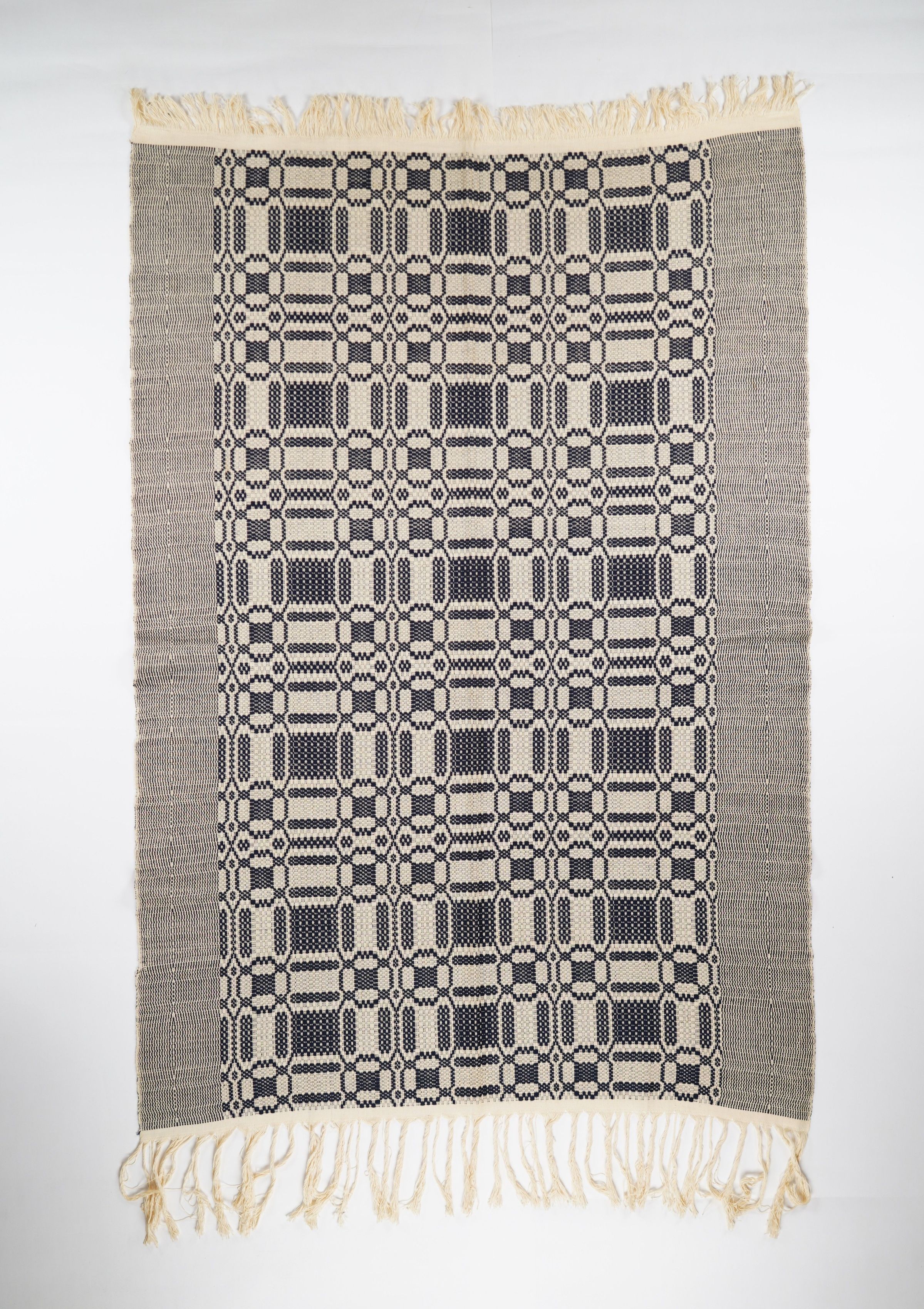 Navy and natural geometric overshot coverlet with border on two sides and self-fringe on two sides. Seamless.Context