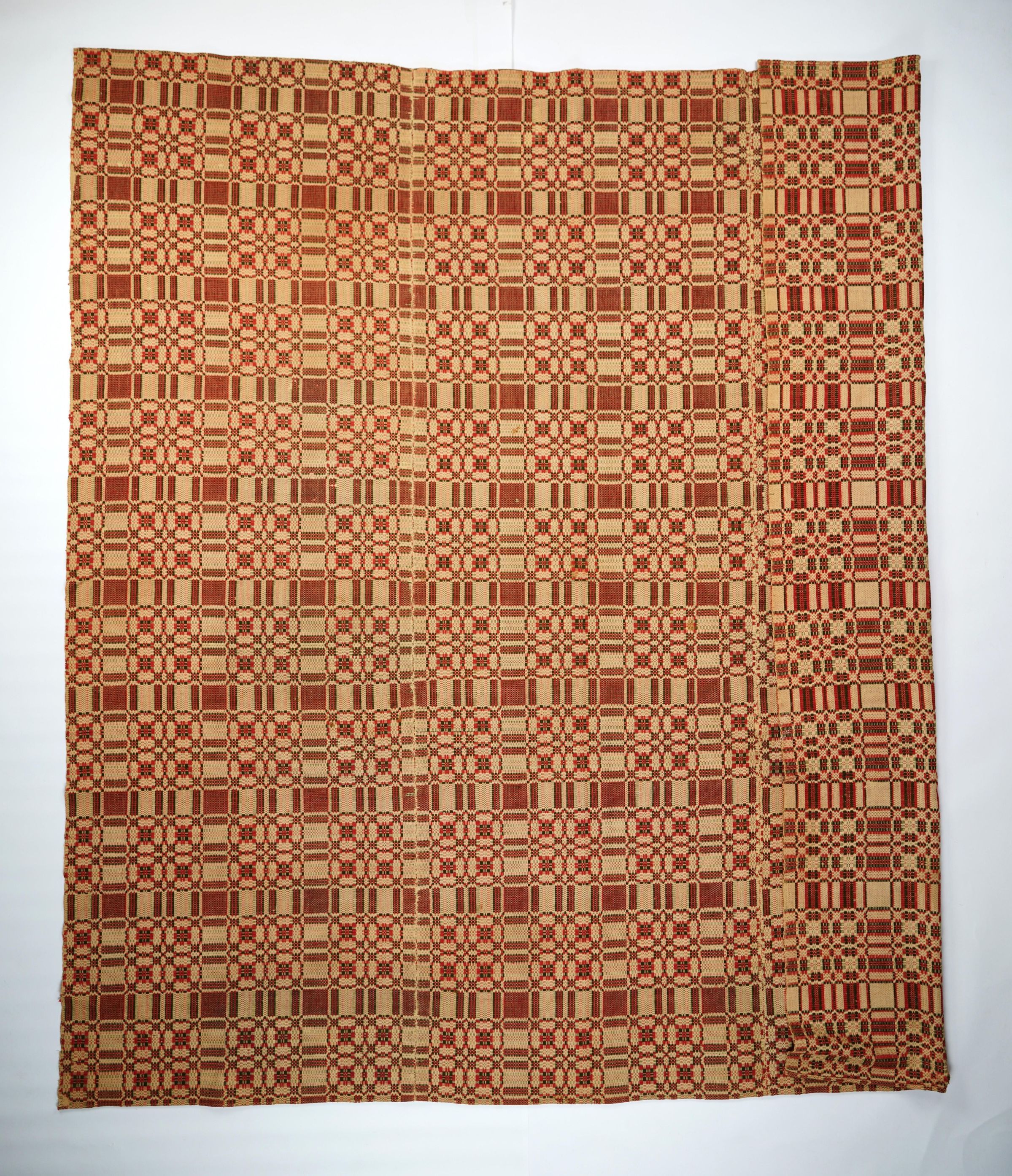 Geometric overshot coverlet with no borders or fringe. Three panels joined by seams. Red and brown wool with natural cotton. Four wheels and table in centerfield pattern.Collection