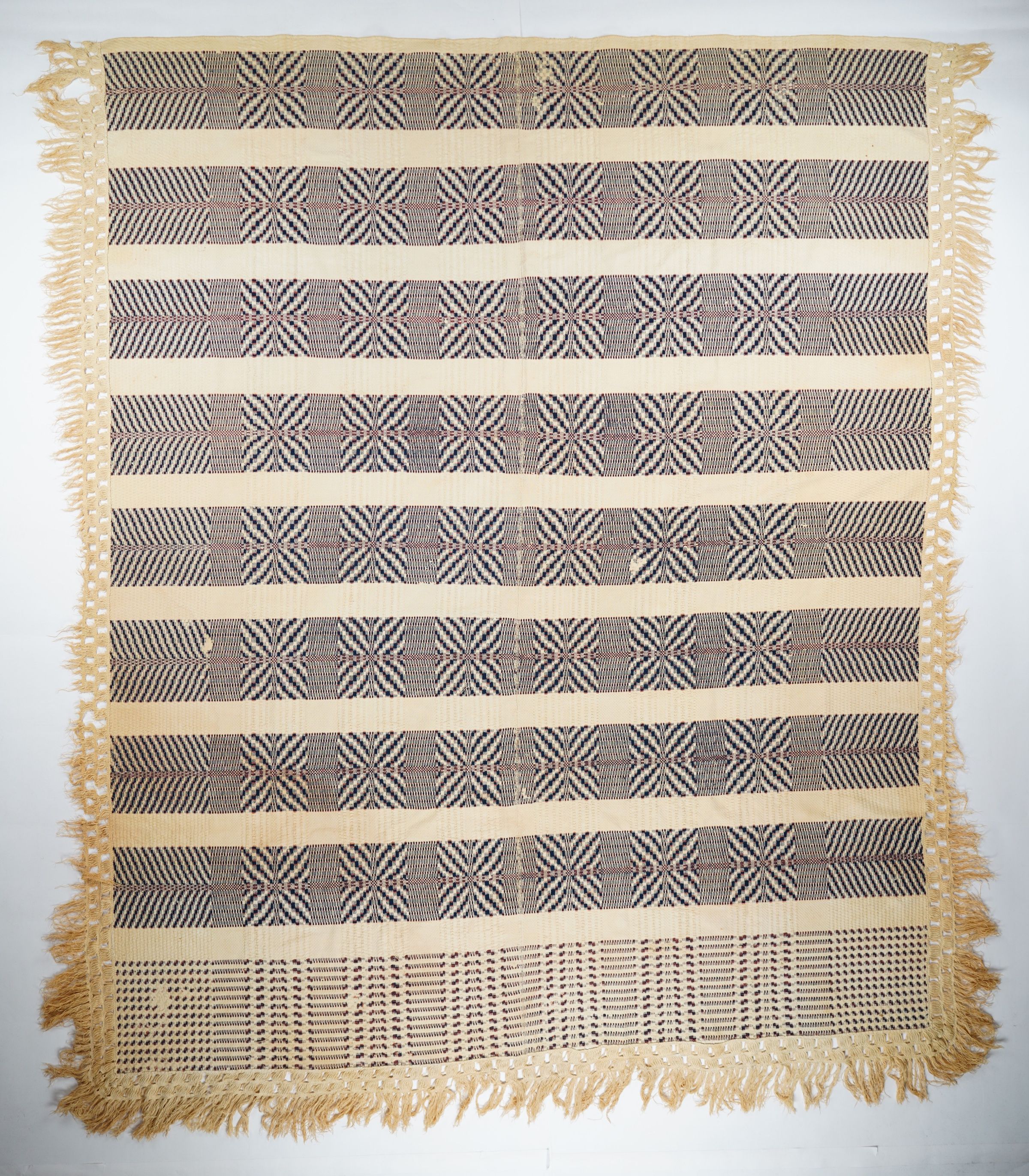 Geometric overshot coverlet with applied fringe on sides and bottom. Two panels joined by a center seam. Navy and red wool with undyed cotton. Abstract centerfield pattern. Unknown weaver.Context