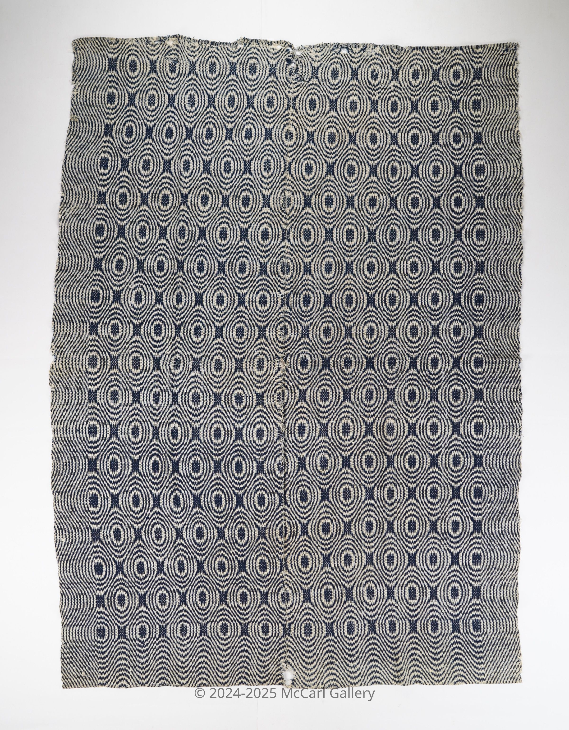 Geometric overshot coverlet with borders on 3 sides and no fringe. Two panels joined by a center seam. Navy wool with undyed cotton. Abstract centerfield pattern; abstract border on sides and bottom. Unknown weaver.Collection