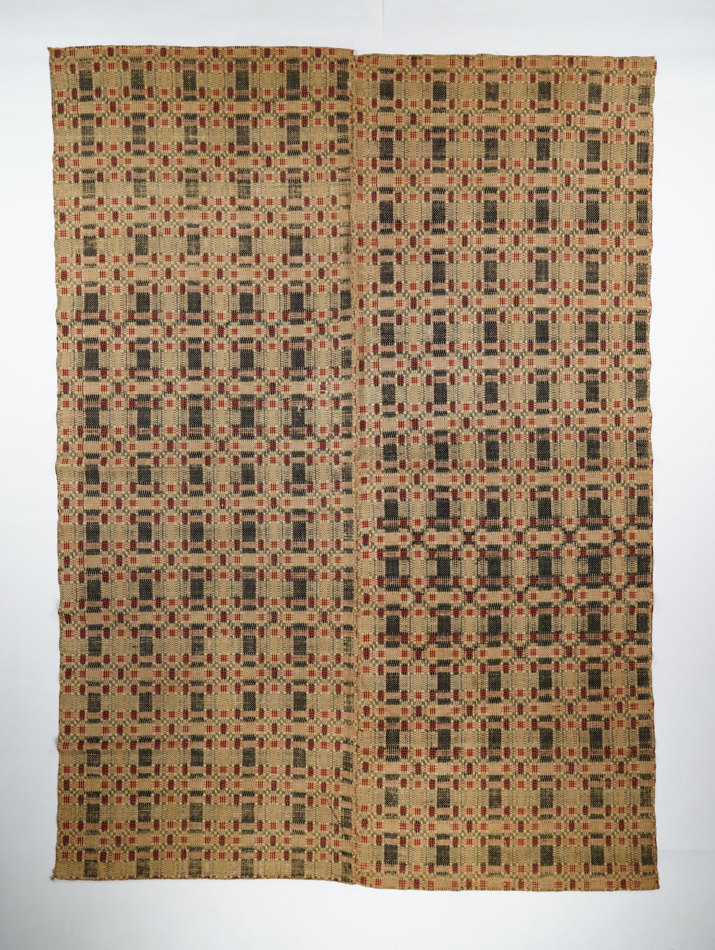 Geometric overshot coverlet with no fringe. Two panels joined by a center seam. Navy and red wool with undyed cotton. Abstract centerfield pattern. Unknown weaver.Context