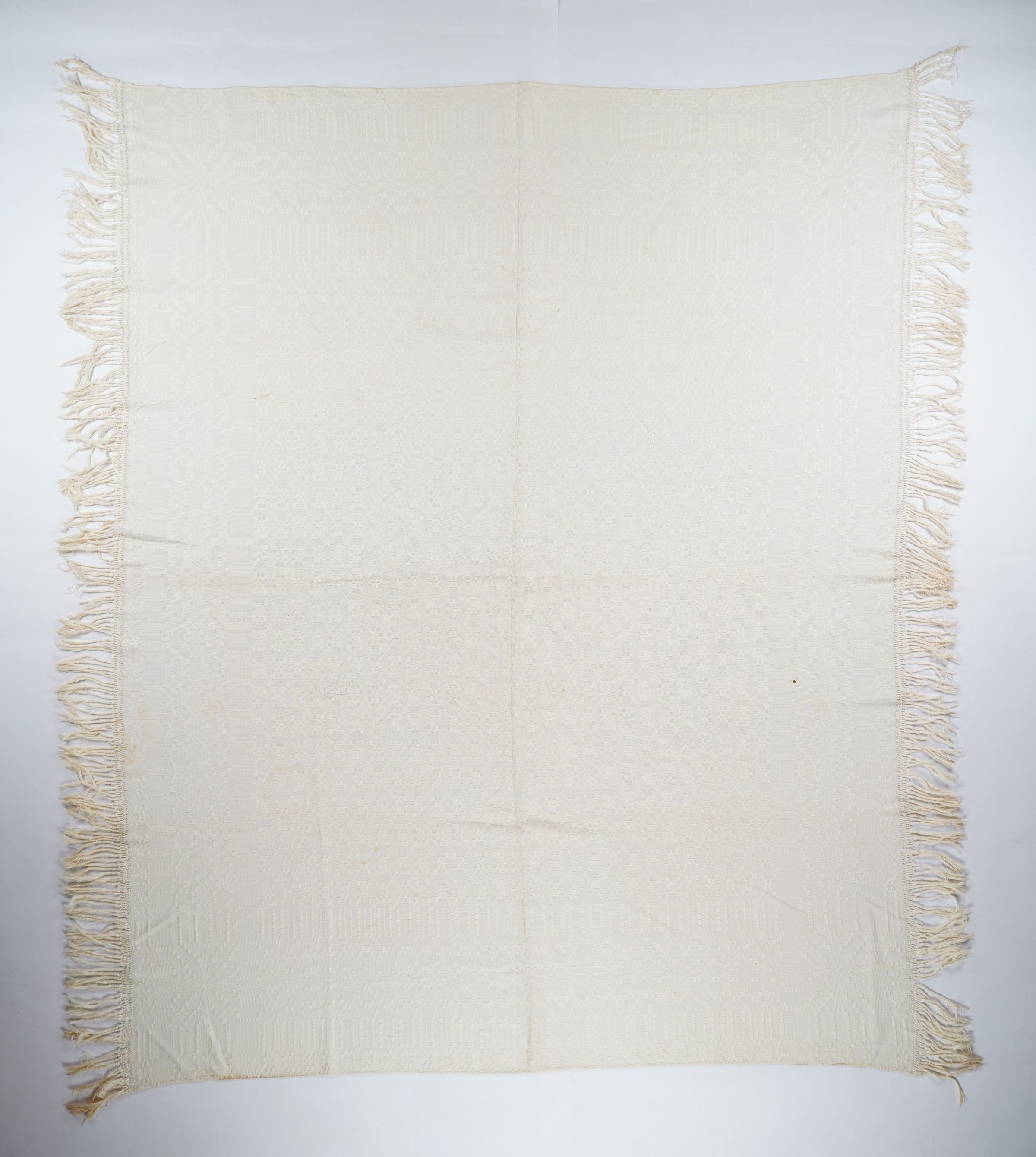 Geometric overshot coverlet with applied fringe on the sides. Two panels joined by a center seam. Undyed cotton. Abstract centerfield pattern. Unknown weaver.Context