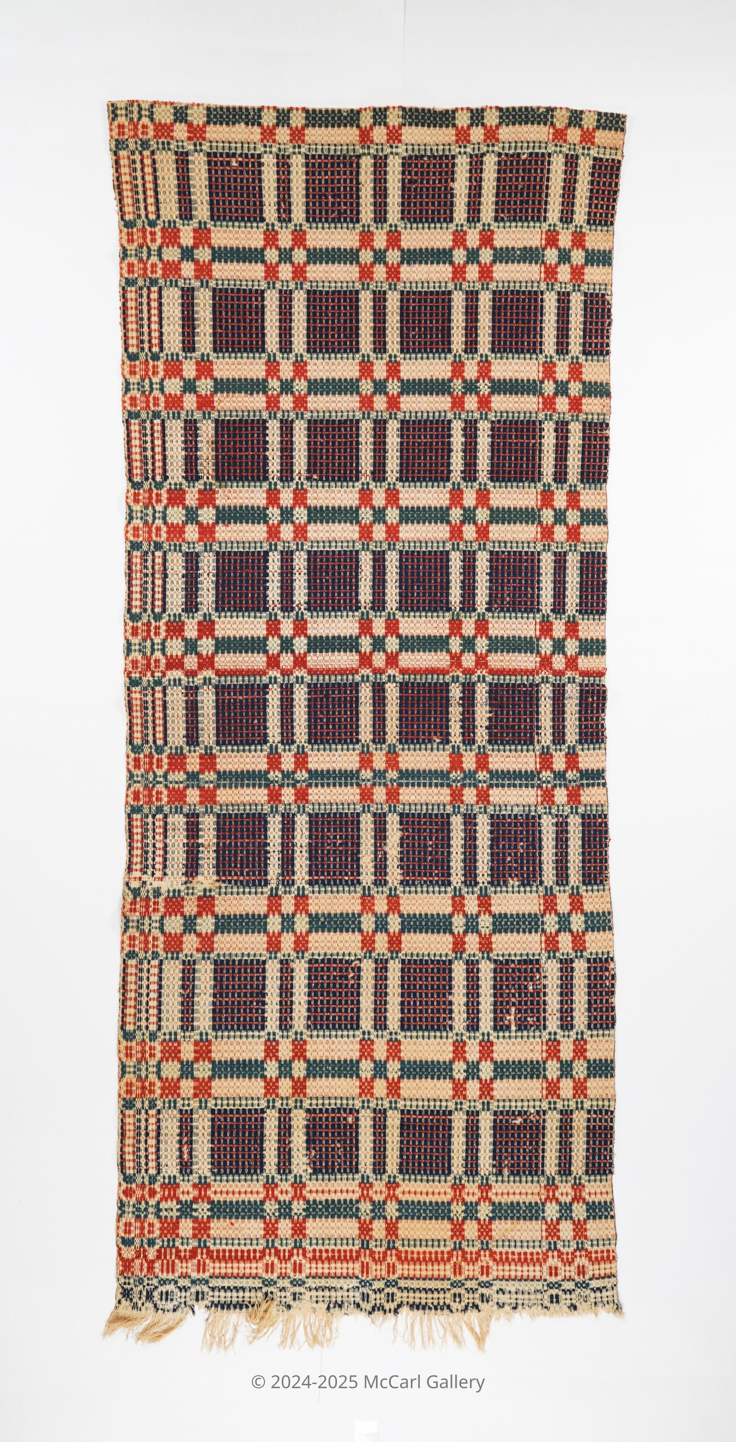 Geometric overshot coverlet with borders on 2 sides and self-fringe on bottom. One single panel. Navy, red, and green wool with undyed cotton. Abstract centerfield pattern; abstract border on side and bottom. Unknown weaver.Collection