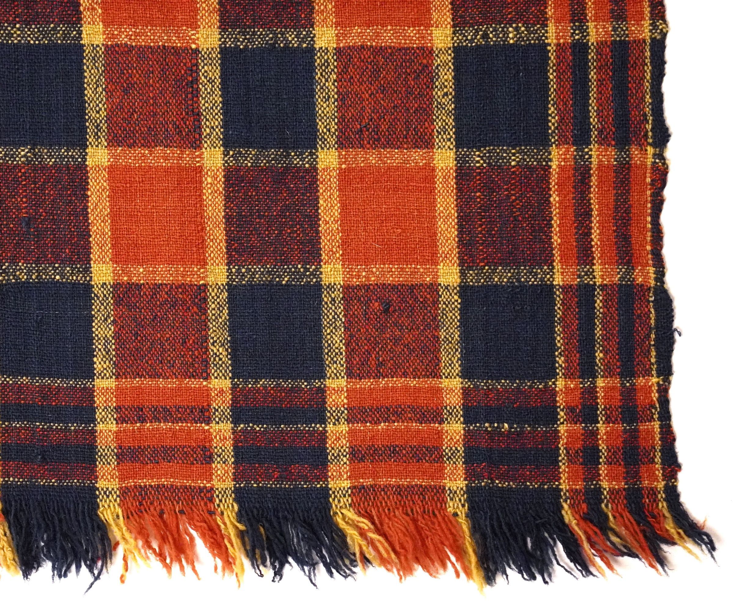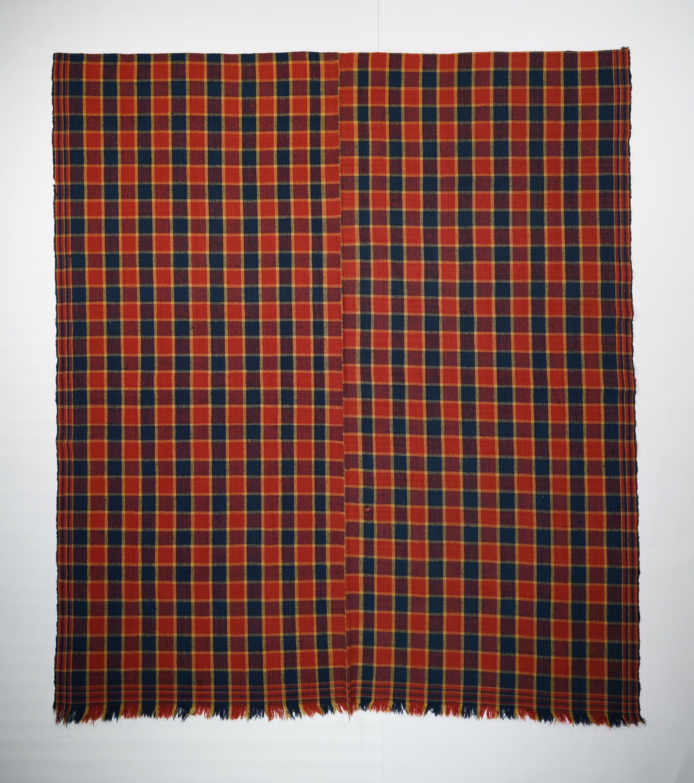 Red, navy, and yellow geometric plainweave coverlet with self-fringe along bottom and border on three sides. Two joined panels.Collection