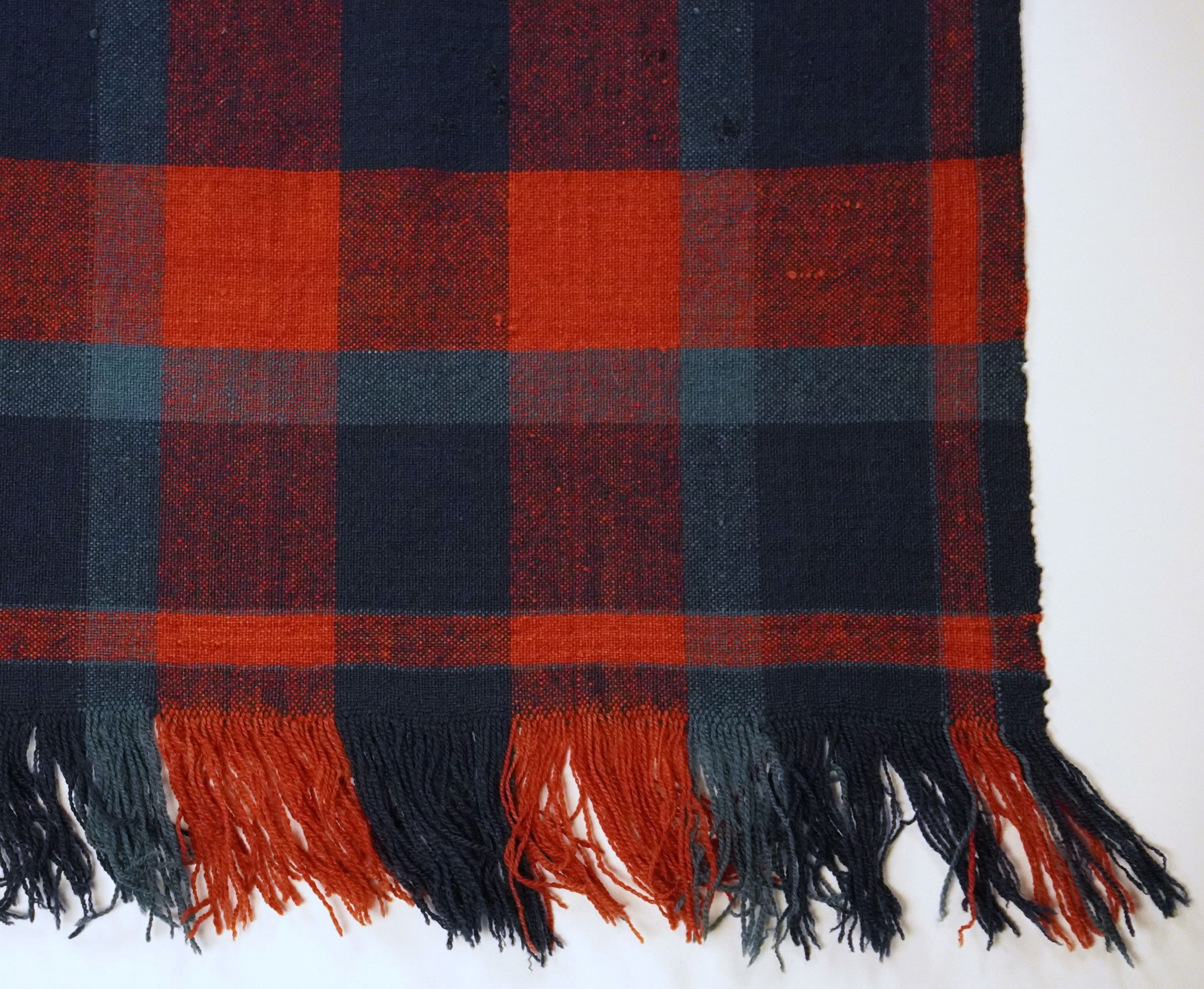 Red, navy, and blue geometric plain weave coverlet with self-fringe along bottom and border on three sides. Two joined panels.Collection