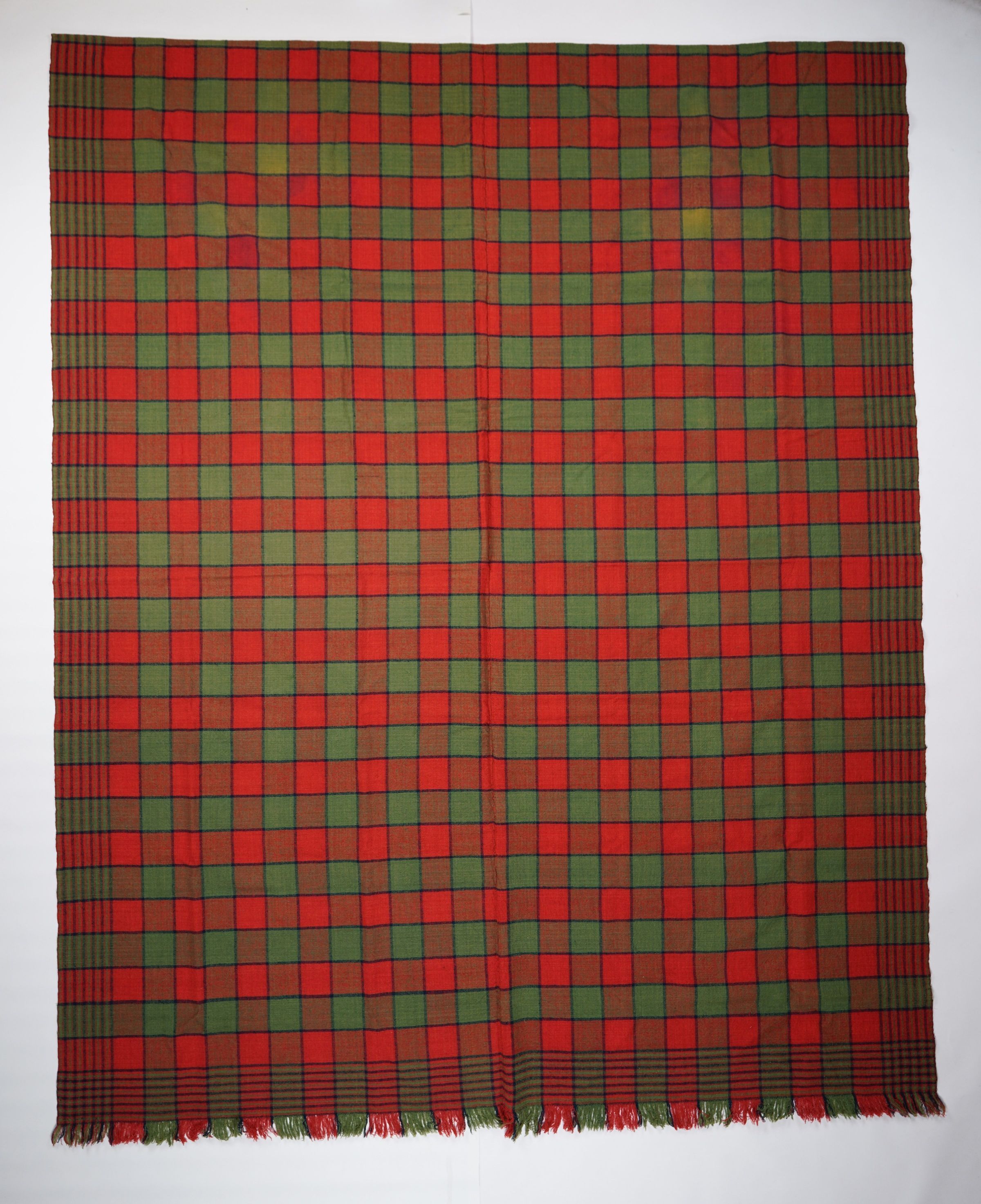 Red, navy, and green geometric plain weave coverlet with border on three sides and self-fringe along bottom. Two joined panels.Collection