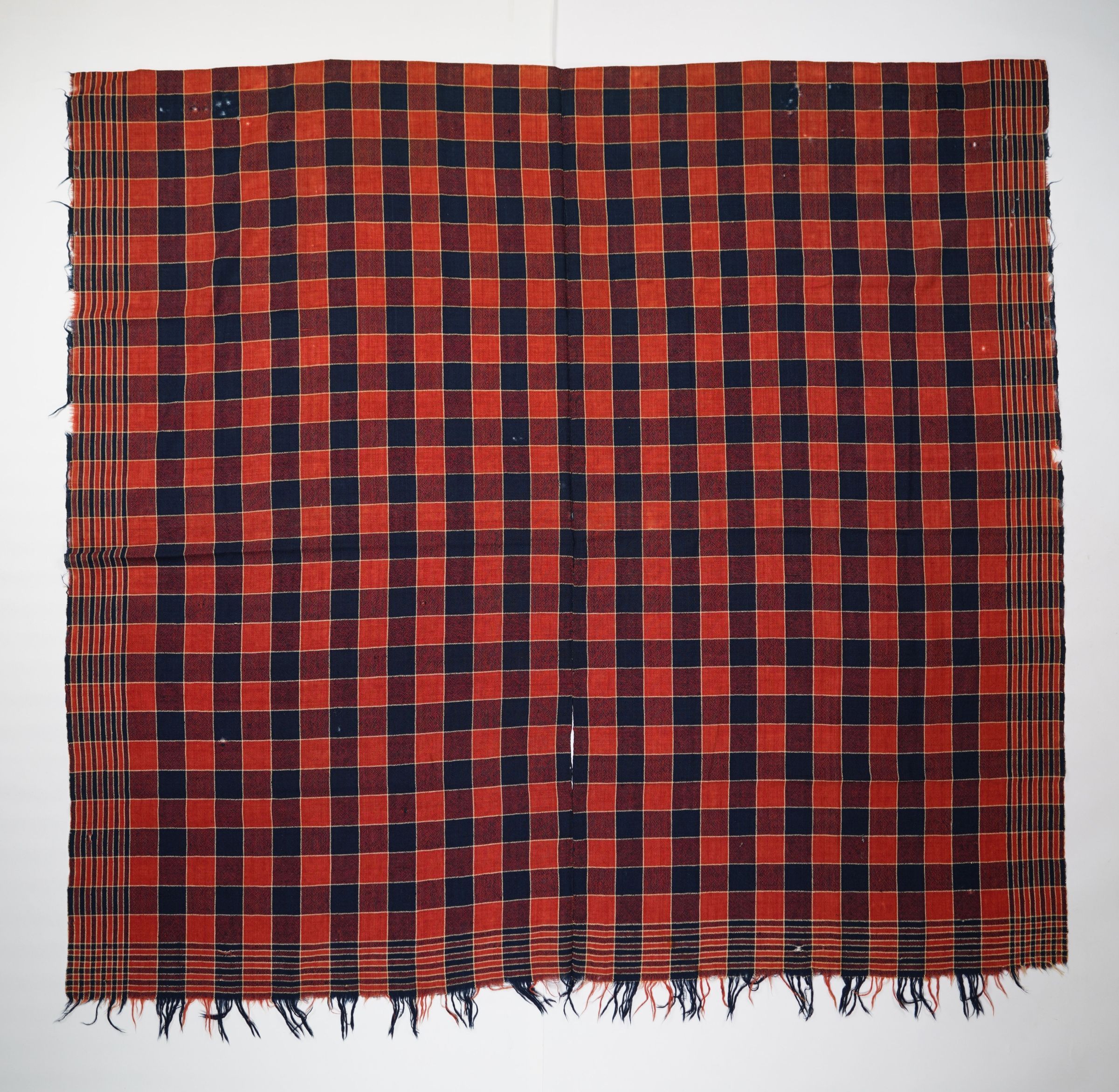 Red, navy, and natural geometric plain weave coverlet with border on three sides and self-fringe along bottom. Two joined panels.Collection