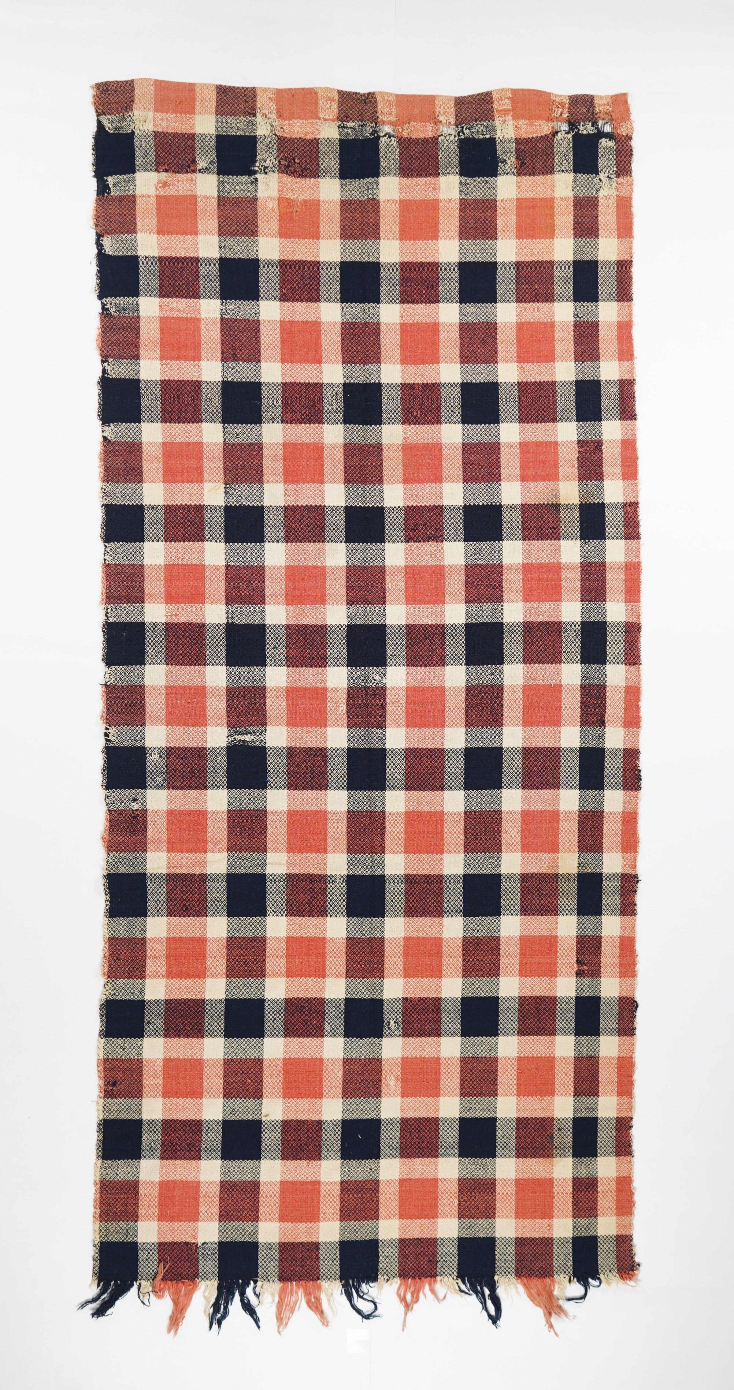 Geometric point twill coverlet with self-fringe on bottom. One single panel. Navy and red wool with undyed cotton. Plaid centerfield pattern. Unknown weaver.Context
