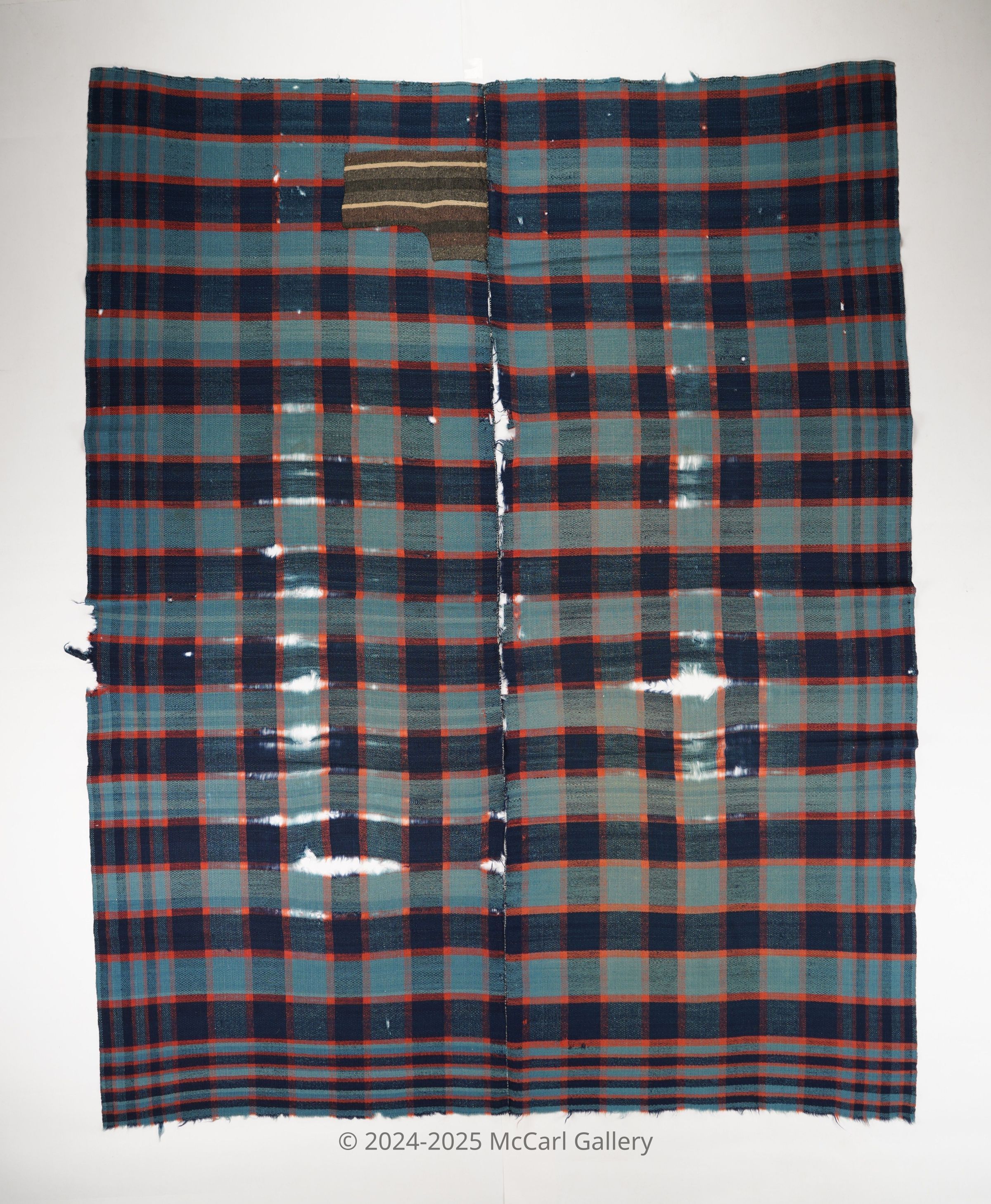 Geometric point twill coverlet with borders on 3 sides and little self-fringe on bottom. Two panels joined by a center seam. Navy and red wool with light blue cotton. Plaid centerfield pattern; abstract border on sides and bottom. Unknown weaver.Collection