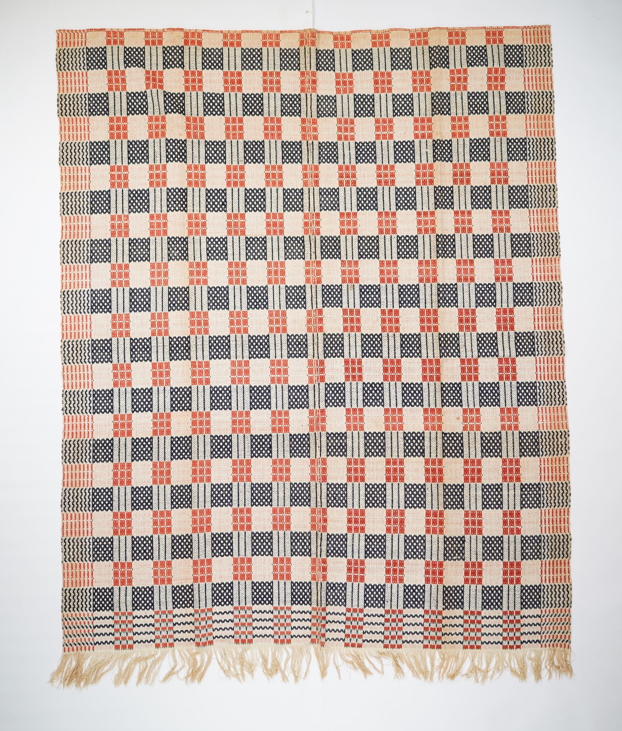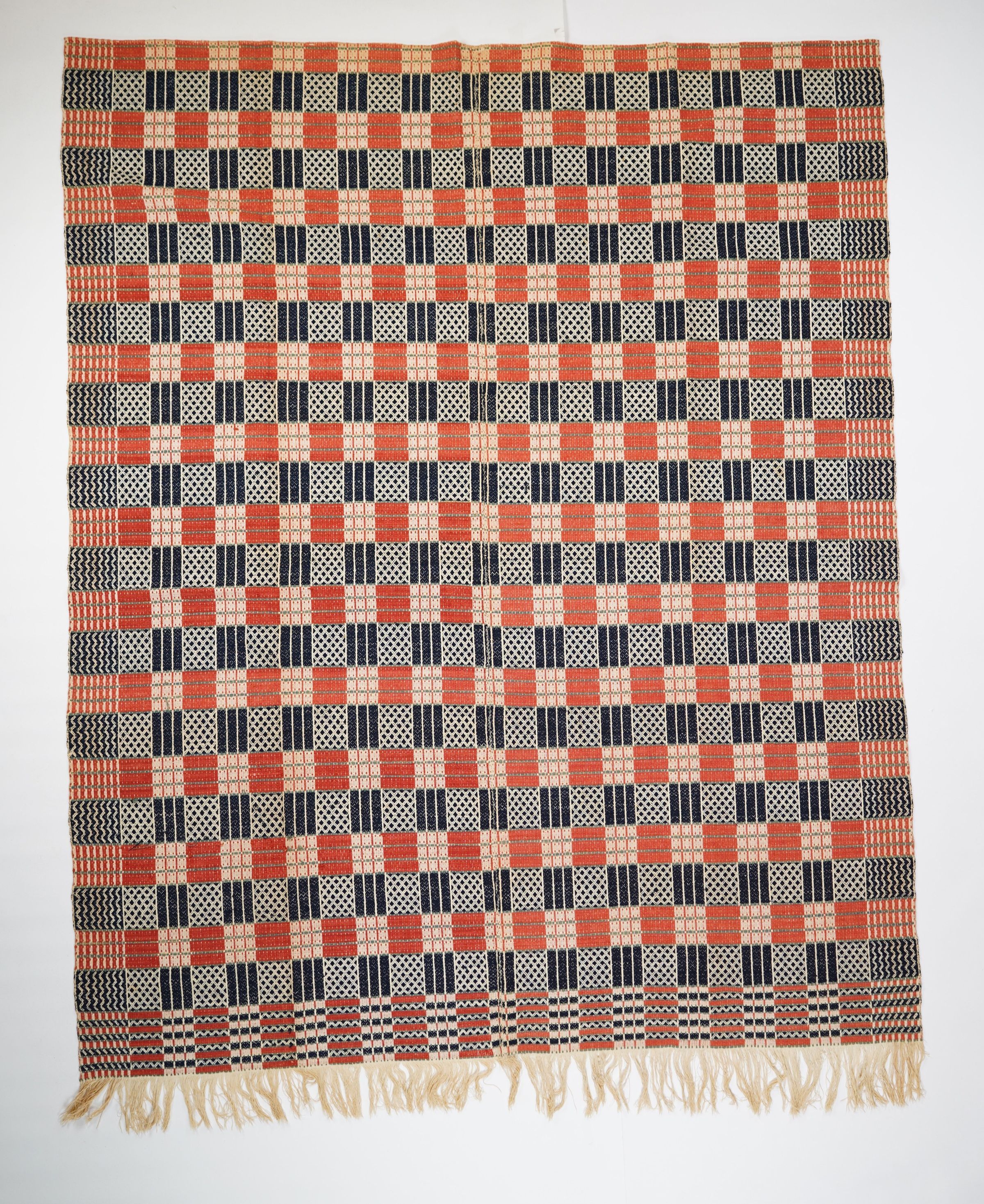 Red, navy, green, and natural geometric coverlet with border on three sides and self-fringe along bottom. Two joined panels.Collection