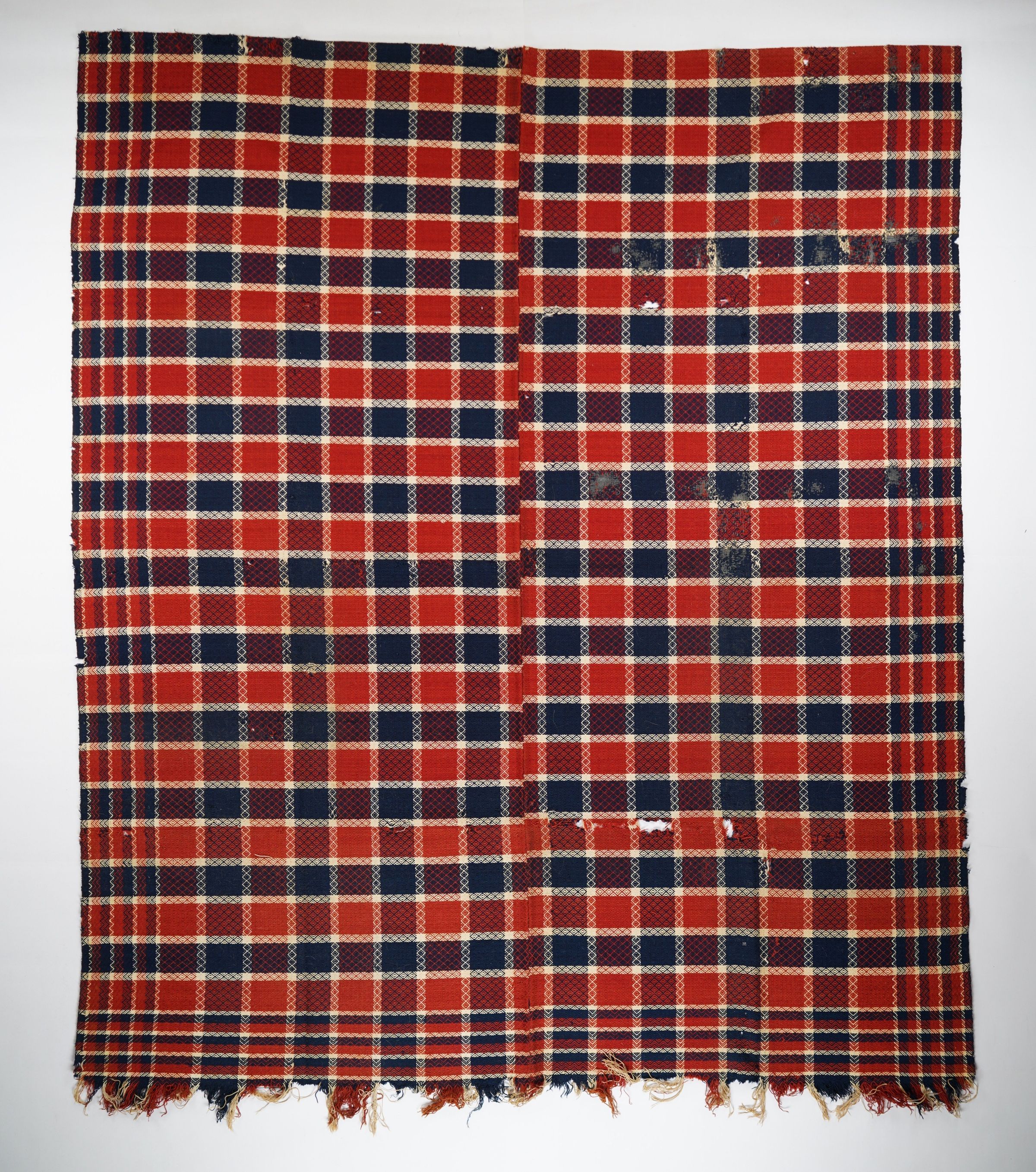 Red, navy, and natural geometric point twill coverlet with border on three sides and self-fringe along bottom. Two joined panels.Context