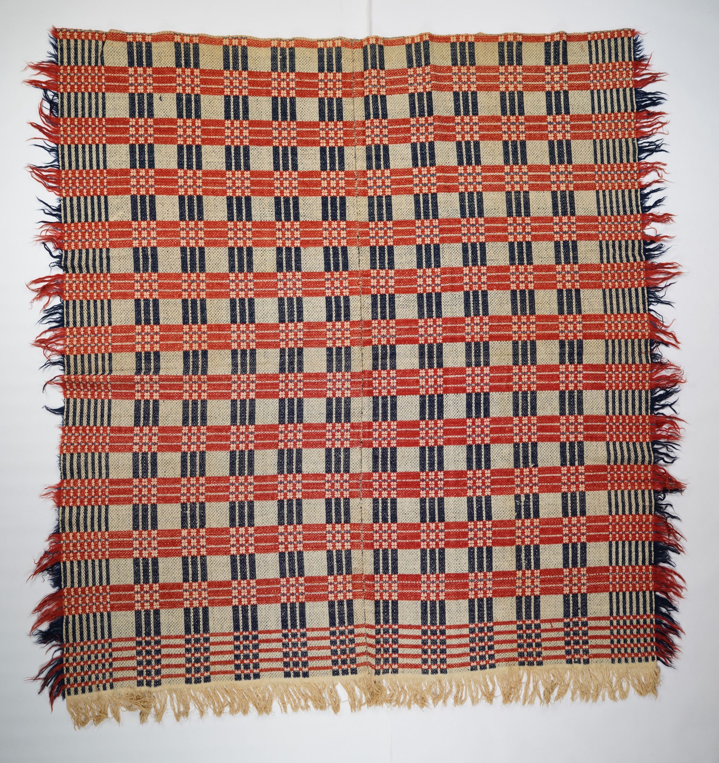 Red, blue, navy, and natural geometric point twill coverlet with border and self-fringe on three sides. Two joined panels.Collection