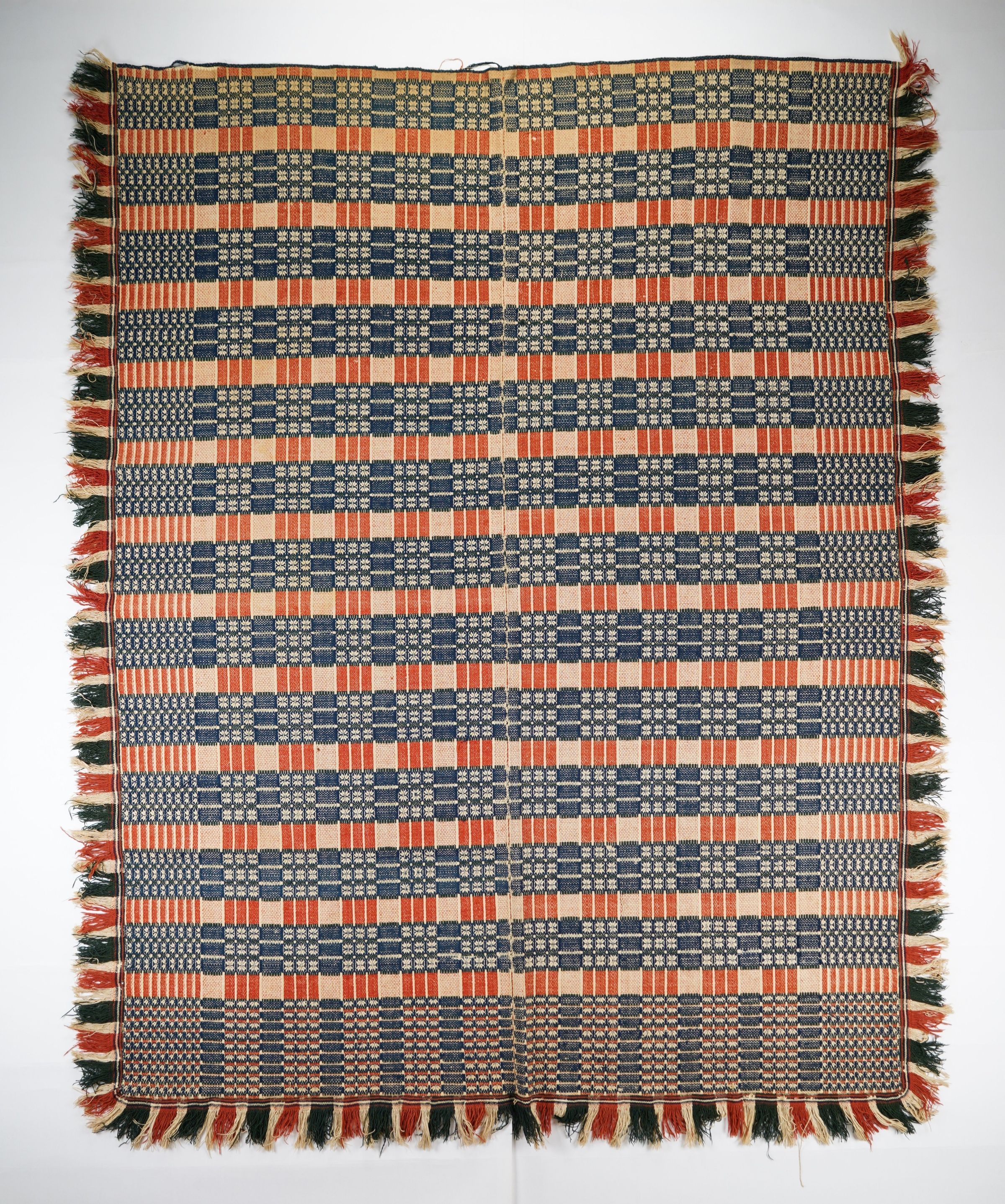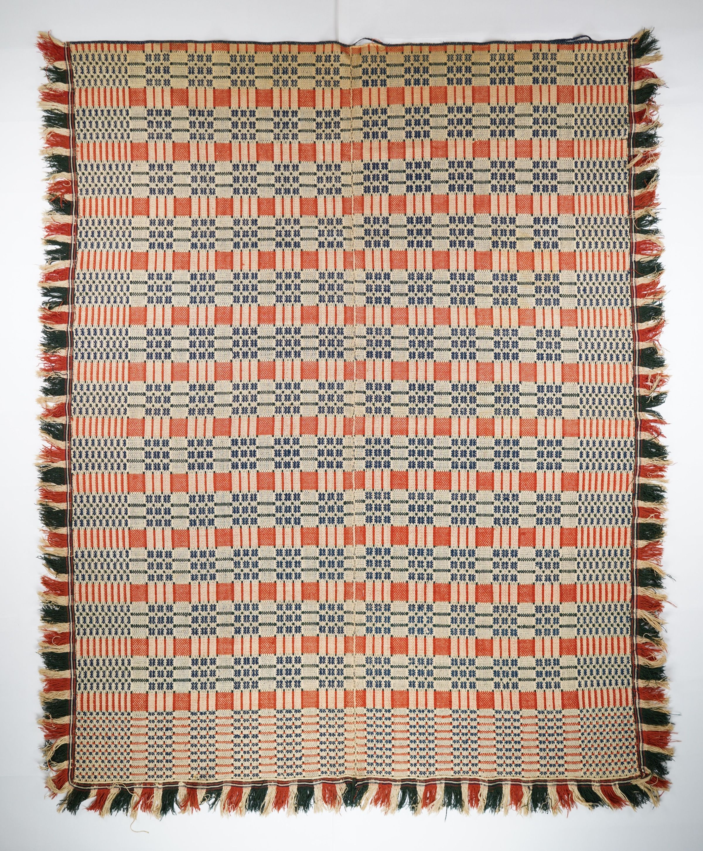 Geometric doubleweave coverlet with borders on 3 sides and applied fringe on sides and bottom. Two panels joined by a center seam. Navy and red wool with undyed cotton. Abstract centerfield pattern; abstract border on sides and bottom. Unknown weaver, embroidered SGM.Context