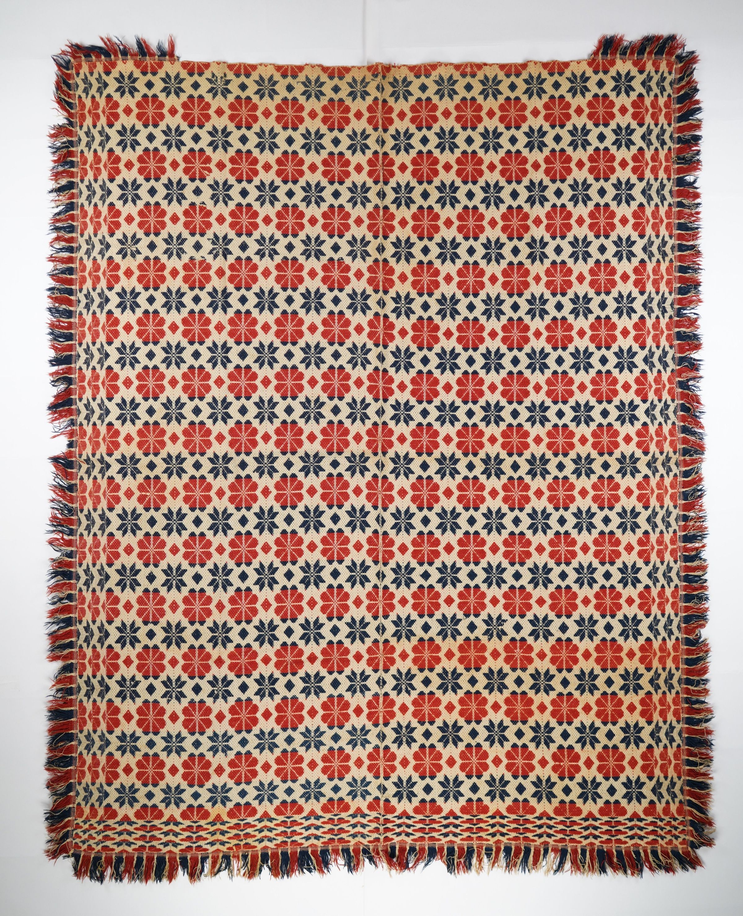 Navy, red, and natural geometric starwork coverlet with fringe.
